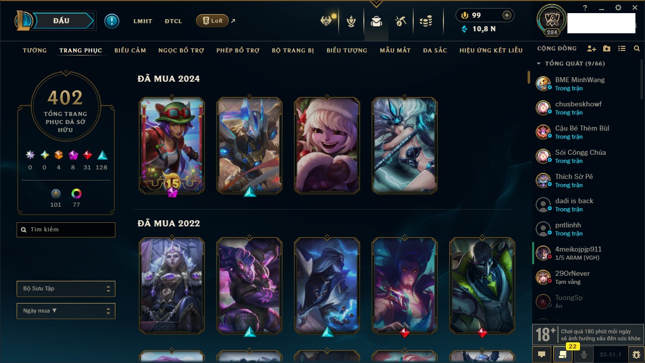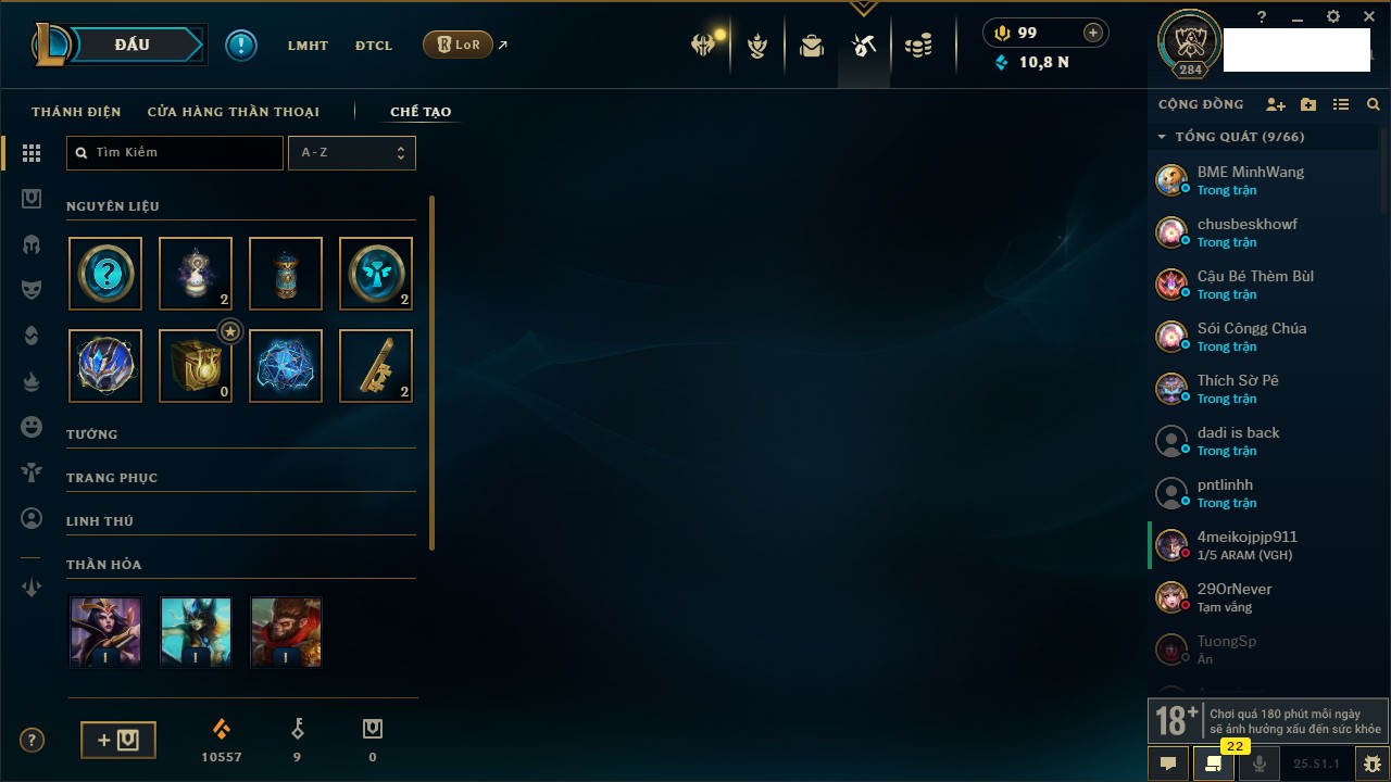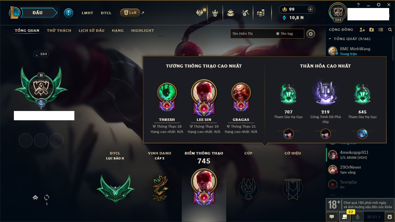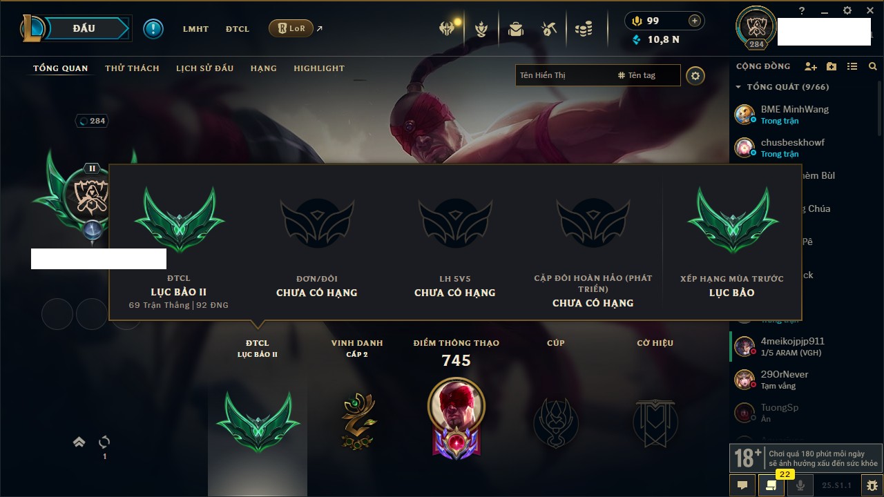 Rank Đơn: Vàng IVKhung: VàngTướng: 172 - Còn 530040 THXTrang Phục: 251Rank ĐTCL: Chưa RankLinh Thú: 70