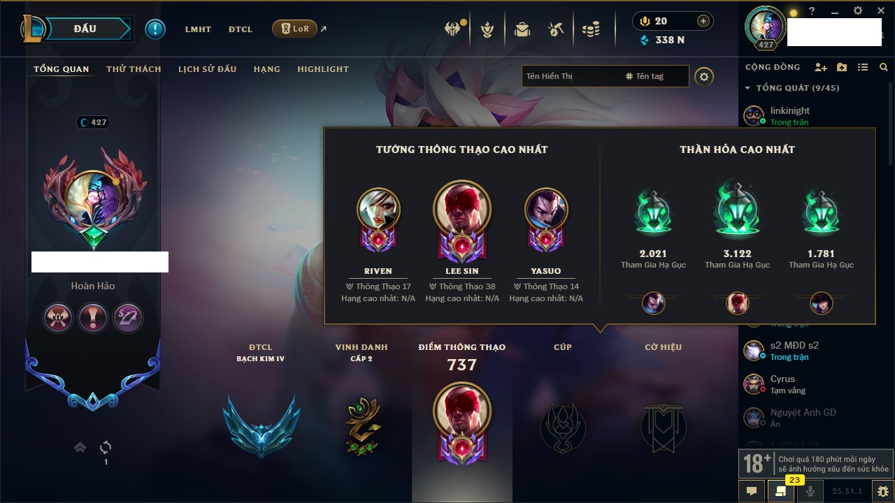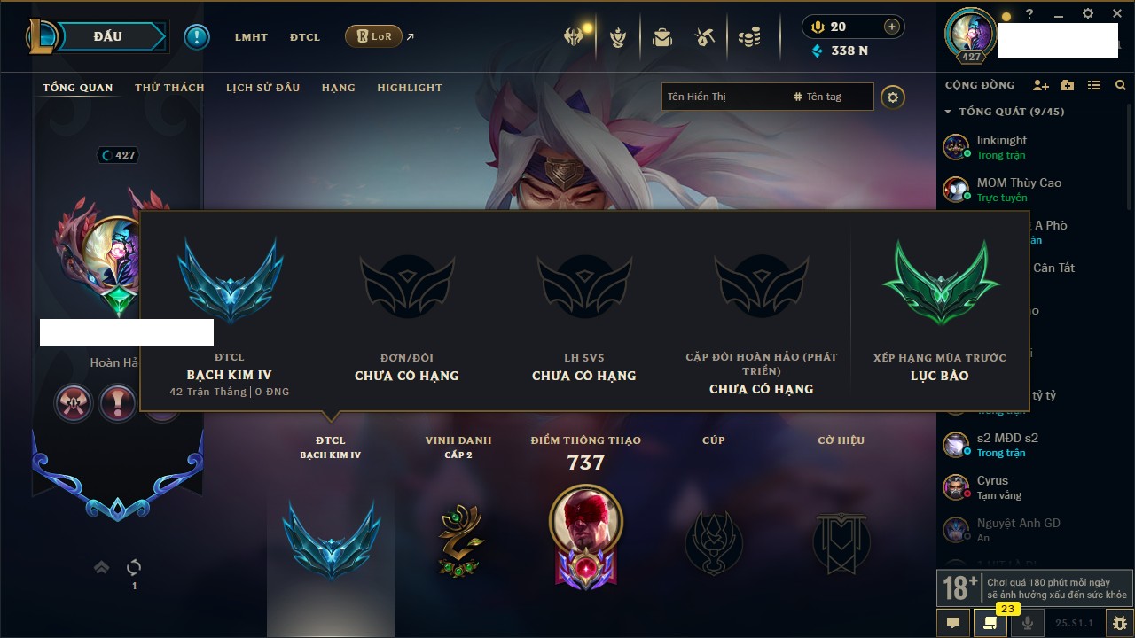 Rank Đơn: Chưa RankKhung: Bạch kimTướng: 172 - Còn 59200 THXTrang Phục: 471Rank ĐTCL: Bạch Kim IIILinh Thú: 114