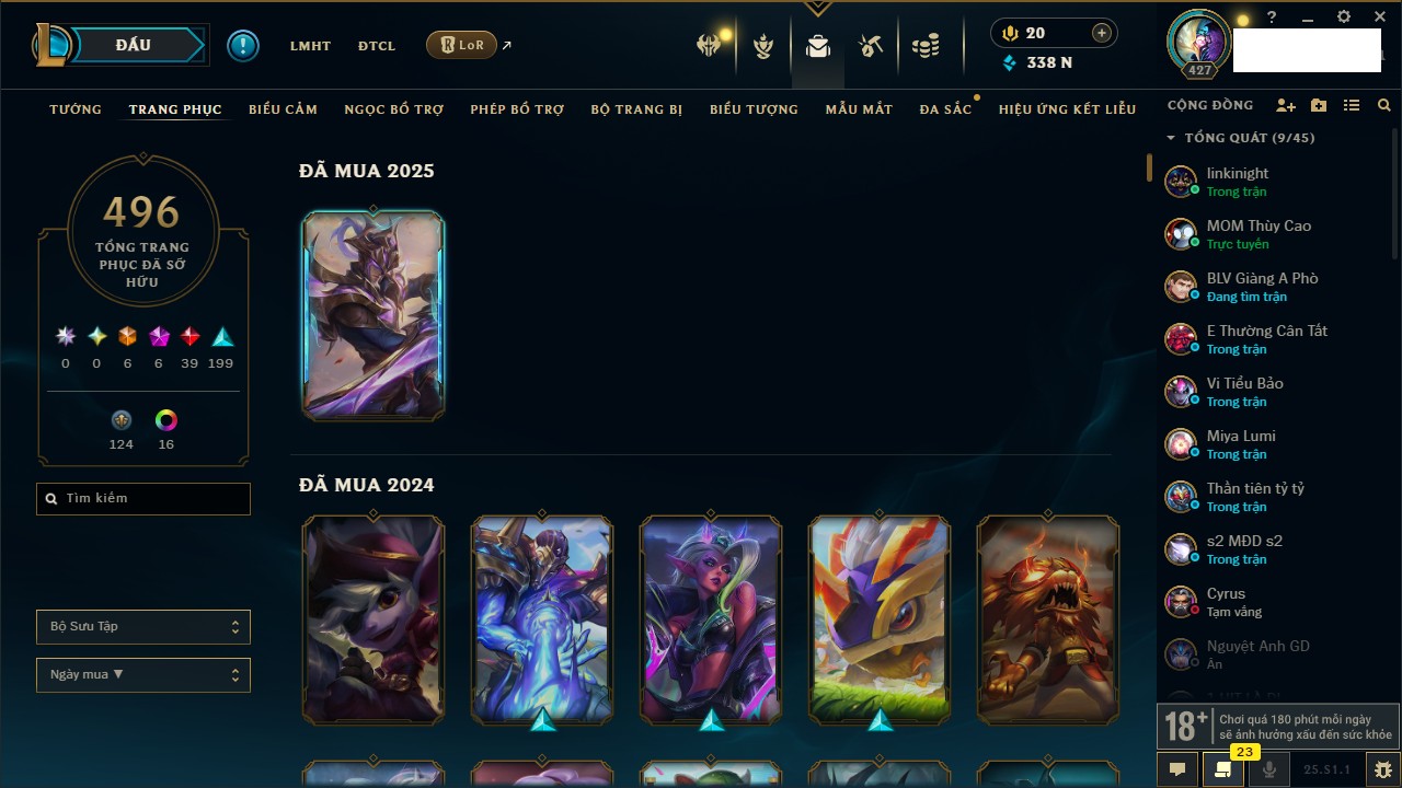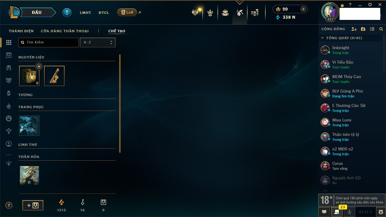 Rank Đơn: Chưa RankKhung: Chưa có khungTướng: 165 - Còn 79975 THXTrang Phục: 210Rank ĐTCL: Chưa RankLinh Thú: 149