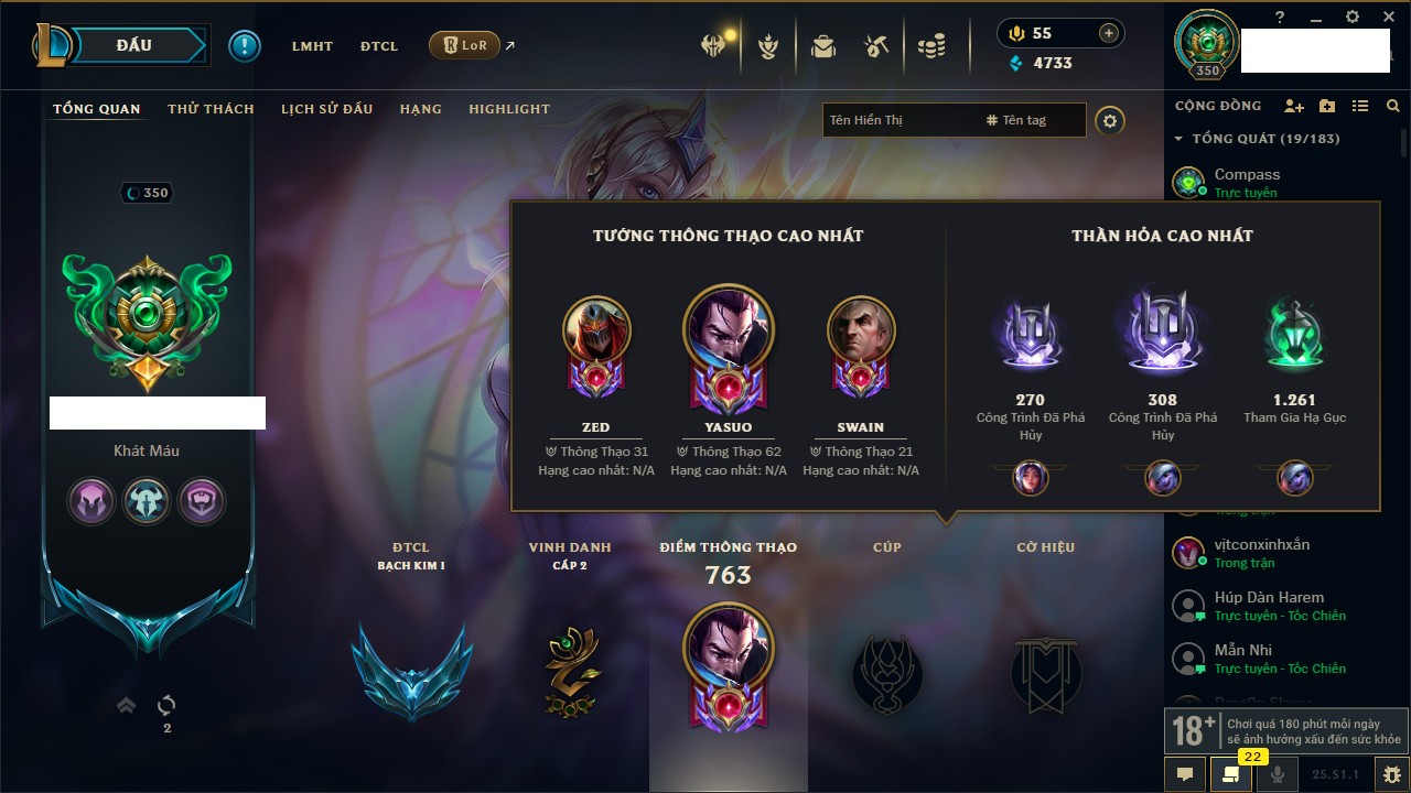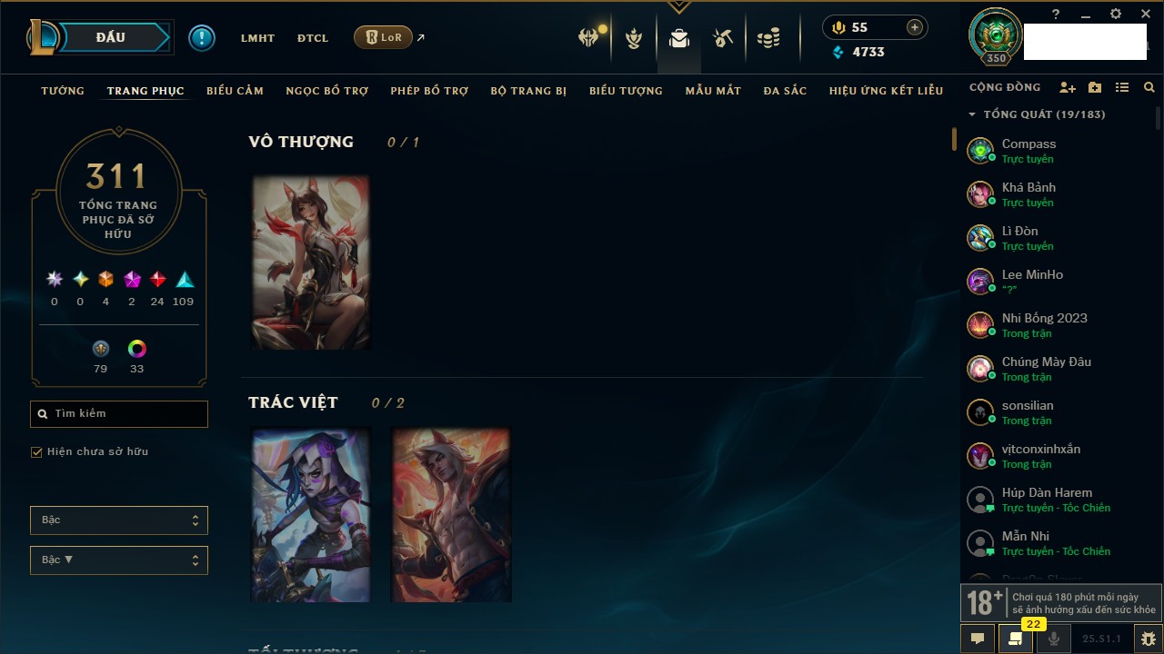 Rank Đơn: Vàng IIIKhung: VàngTướng: 171 - Còn 88128 THXTrang Phục: 329Rank ĐTCL: Chưa RankLinh Thú: 41