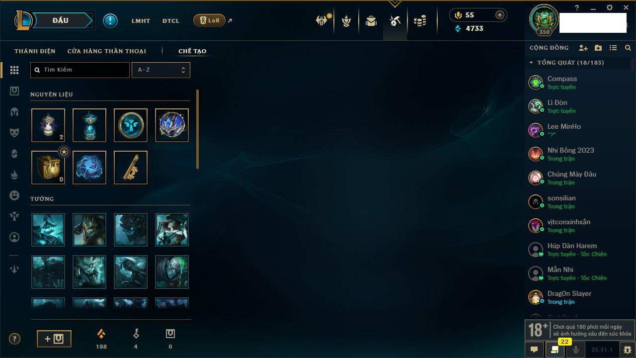 Rank Đơn: Vàng IVKhung: VàngTướng: 171 - Còn 660284 THXTrang Phục: 199Rank ĐTCL: Chưa RankLinh Thú: 34