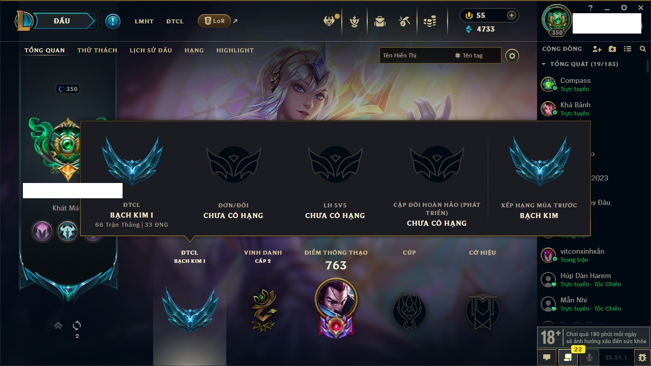 Rank Đơn: Bạc IIIKhung: ĐồngTướng: 171 - Còn 176499 THXTrang Phục: 244Rank ĐTCL: Vàng IVLinh Thú: 166