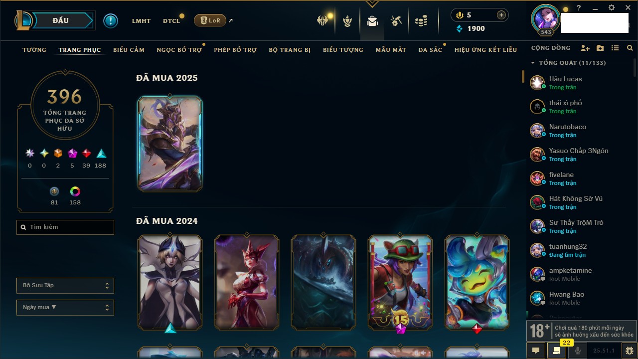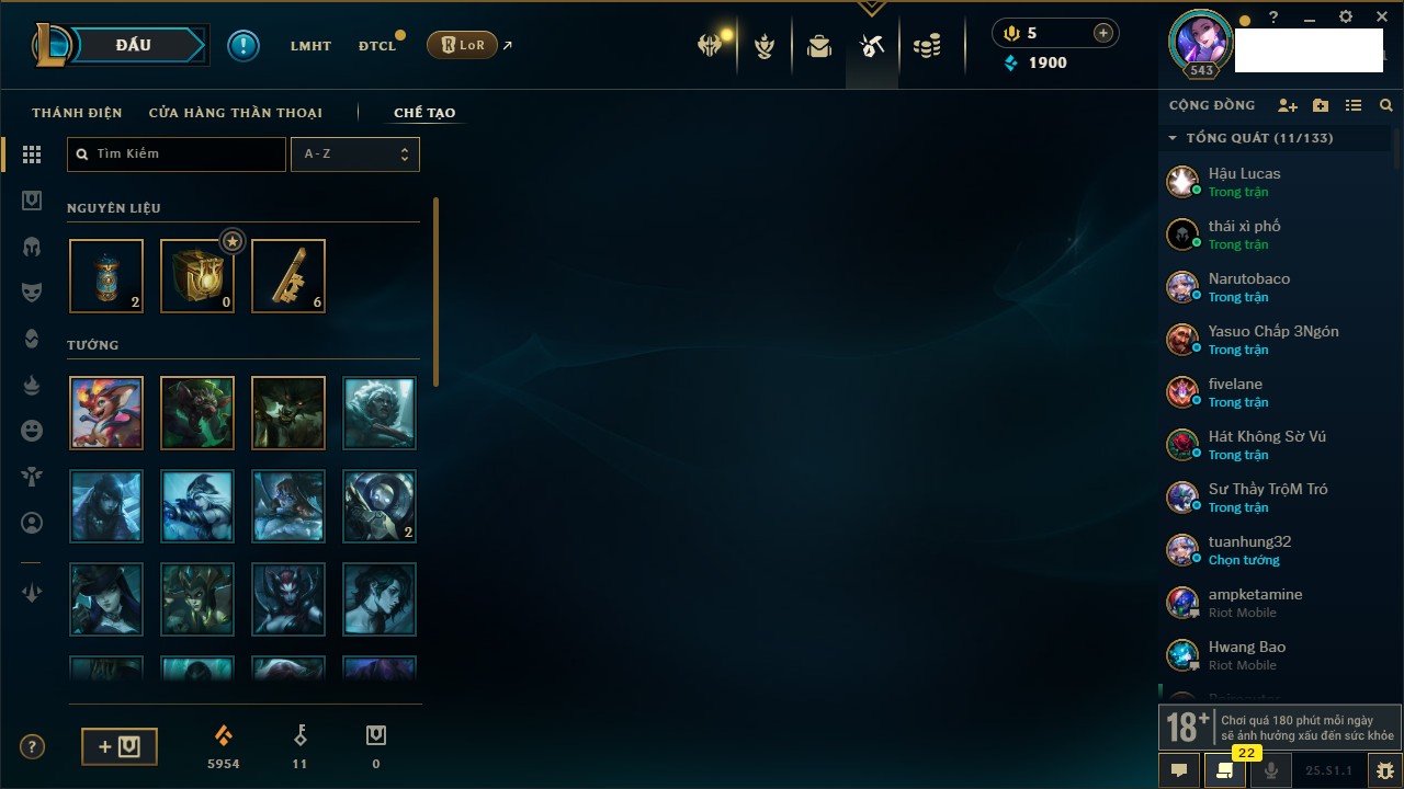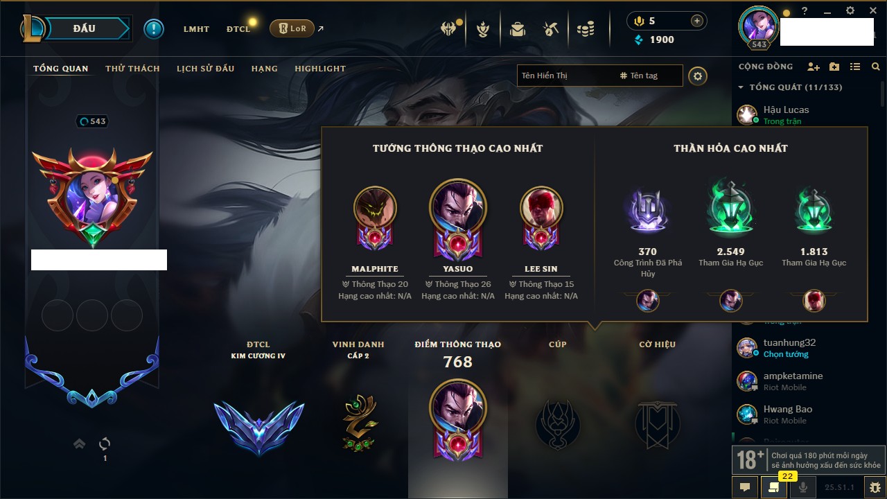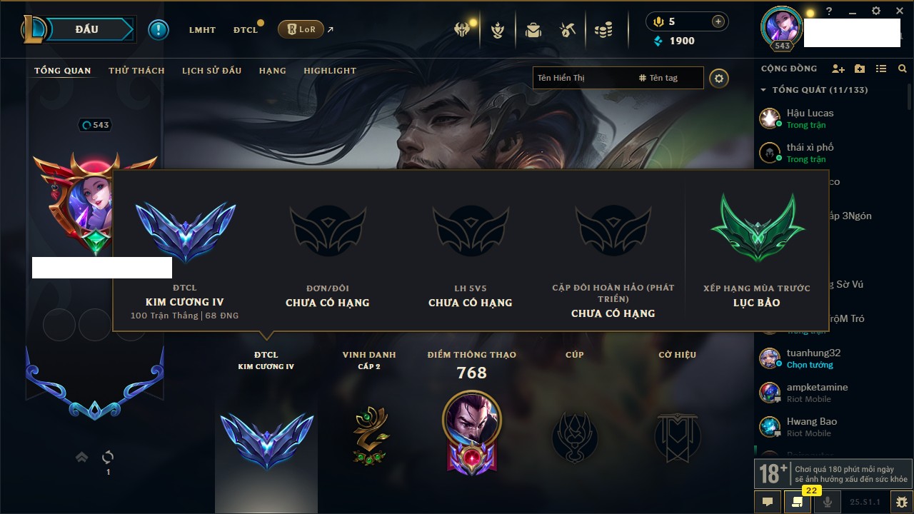 Rank Đơn: Chưa RankKhung: Bạch kimTướng: 171 - Còn 250924 THXTrang Phục: 355Rank ĐTCL: Chưa RankLinh Thú: 230