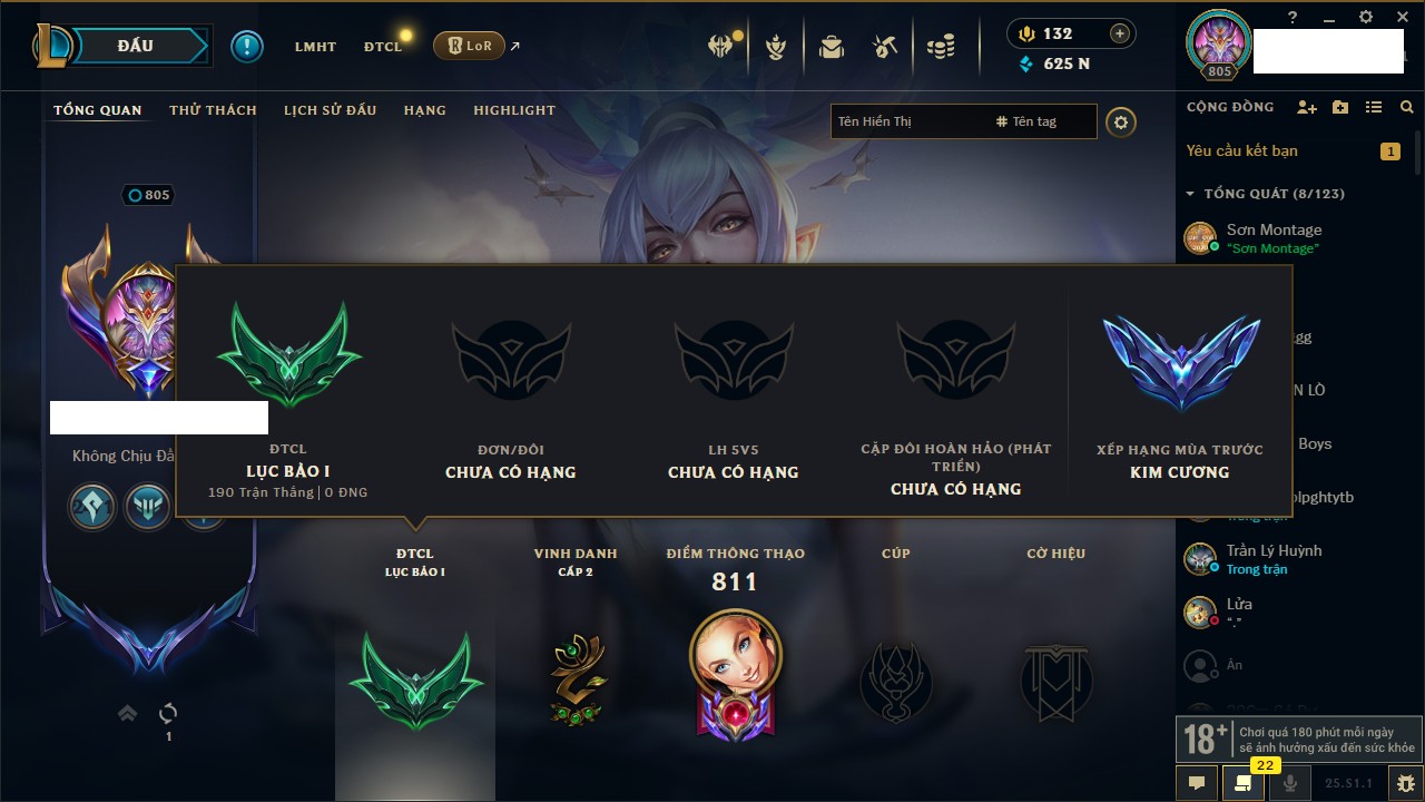 Rank Đơn: Chưa rank mùa nàoKhung: Chưa có khungTướng: 170 - Còn 58674 THXTrang Phục: 32Rank ĐTCL: Bạch Kim IIILinh Thú: 299