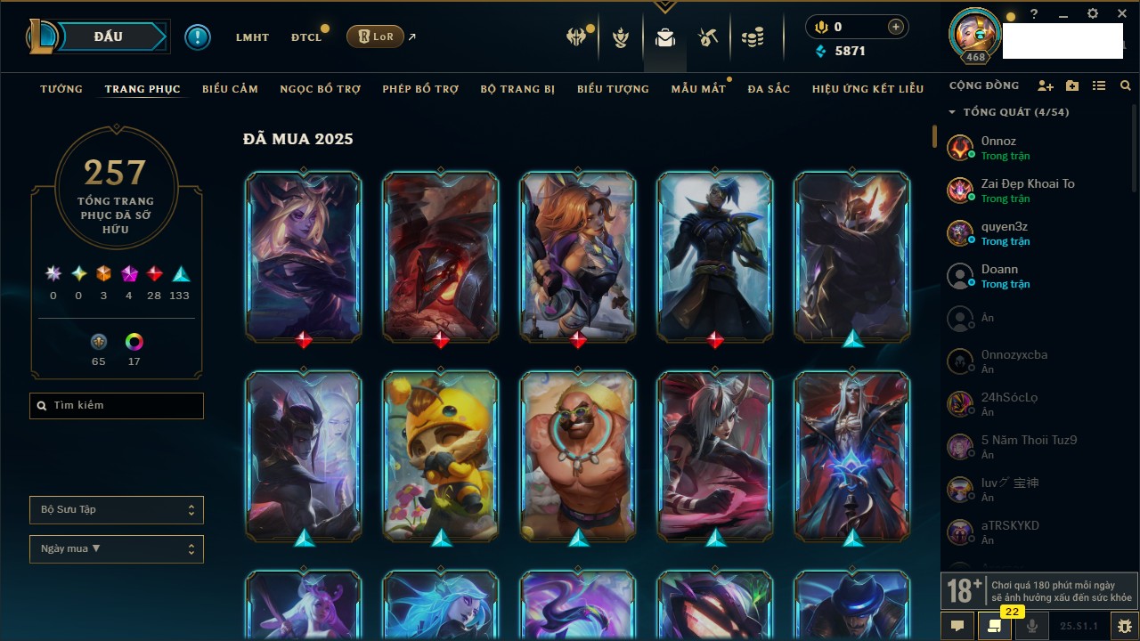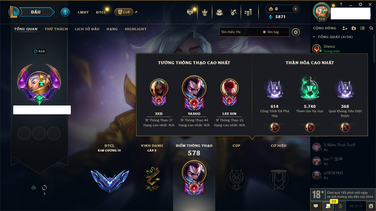 Rank Đơn: Đồng IIKhung: Chưa có khungTướng: 170 - Còn 2078 THXTrang Phục: 72Rank ĐTCL: Đồng ILinh Thú: 133