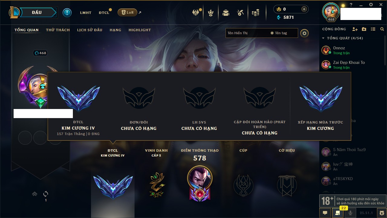 Rank Đơn: Lục Bảo IVKhung: VàngTướng: 171 - Còn 154648 THXTrang Phục: 203Rank ĐTCL: Bạch Kim IVLinh Thú: 69