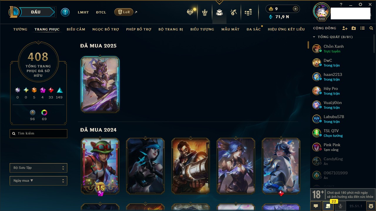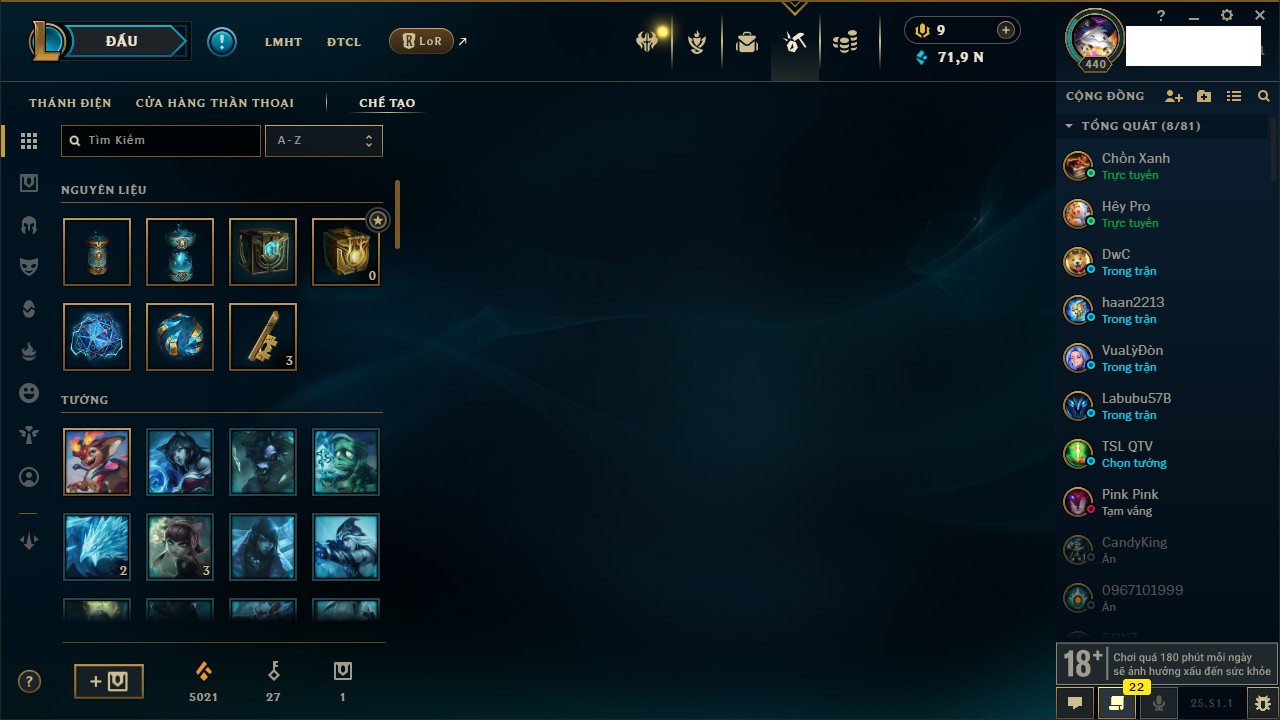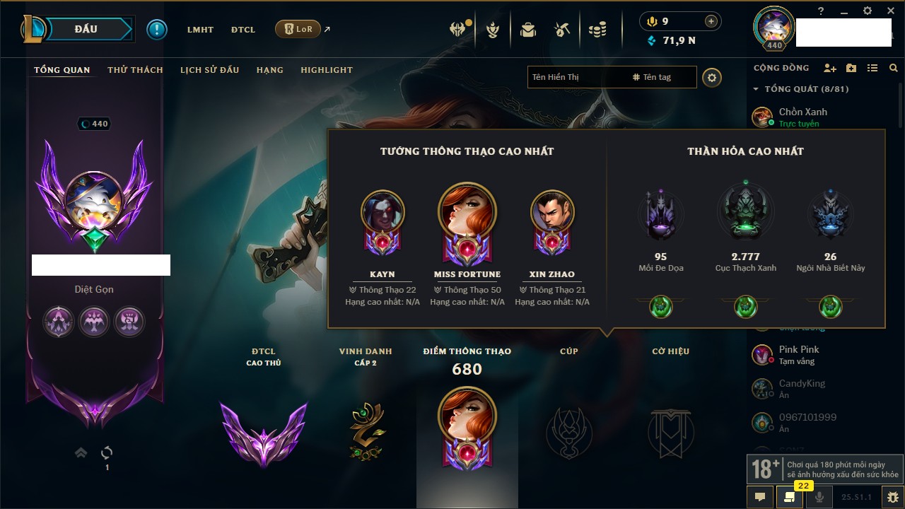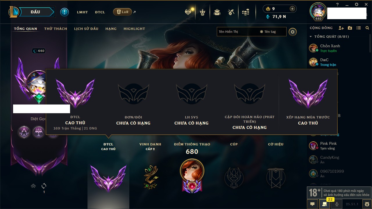 Rank Đơn: Bạc IIKhung: Bạch kimTướng: 169 - Còn 81813 THXTrang Phục: 301Rank ĐTCL: Chưa RankLinh Thú: 140