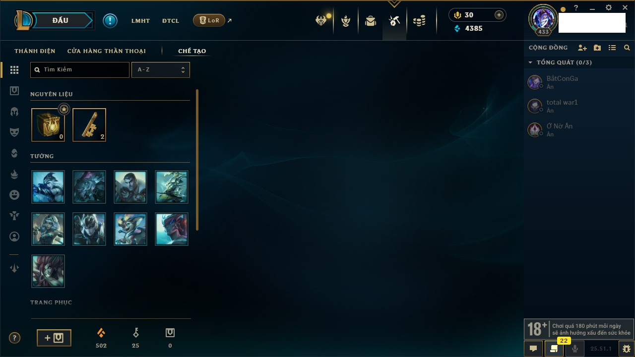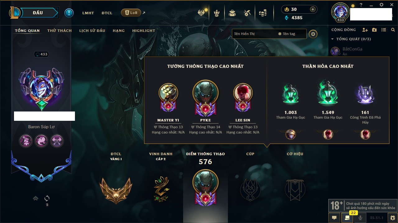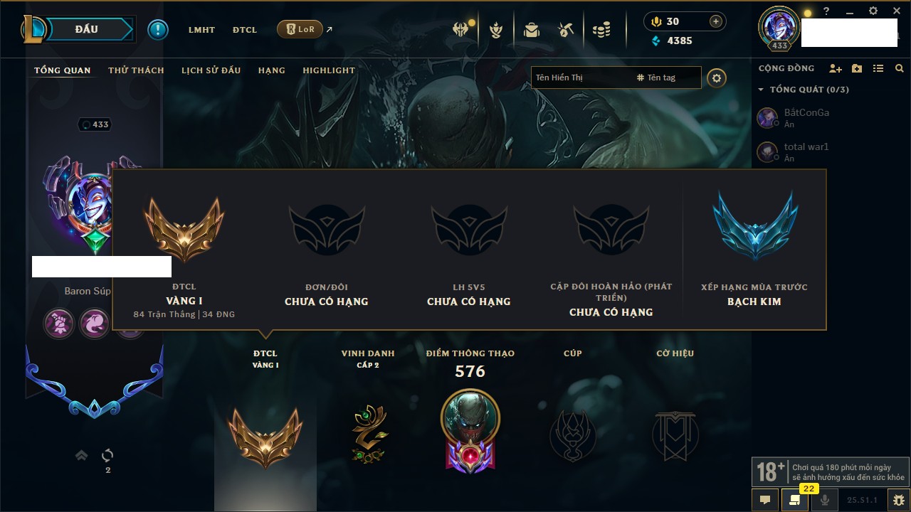 Rank Đơn: Bạc IVKhung: BạcTướng: 171 - Còn 263852 THXTrang Phục: 384Rank ĐTCL: Bạch Kim IIILinh Thú: 125