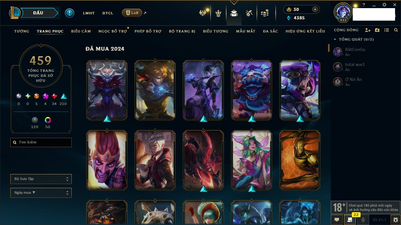 Rank Đơn: Bạc IIKhung: Bạch kimTướng: 169 - Còn 81813 THXTrang Phục: 301Rank ĐTCL: Chưa RankLinh Thú: 140