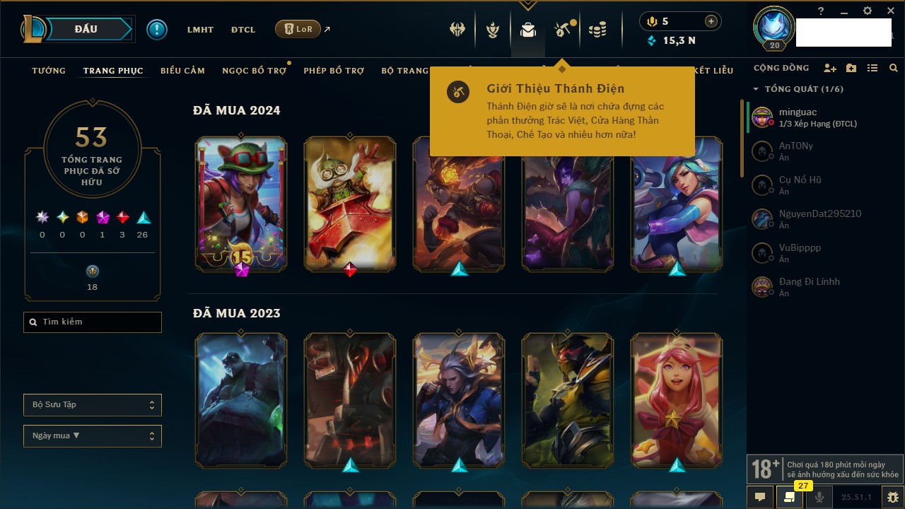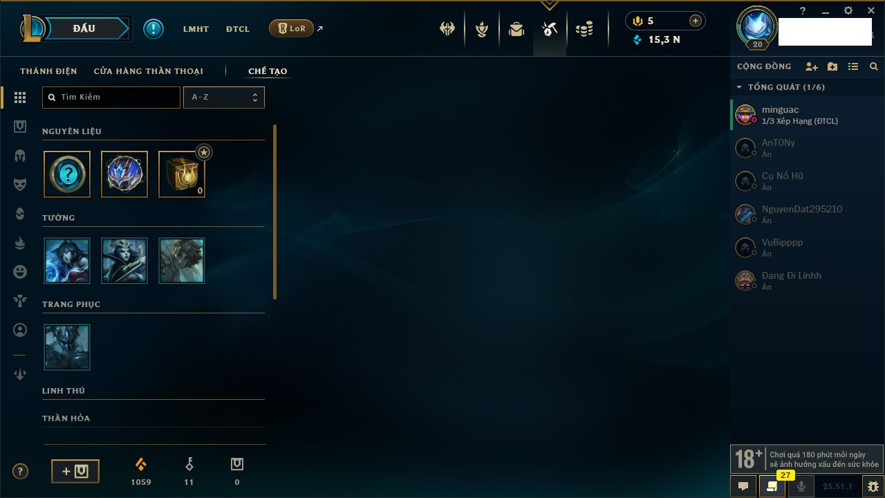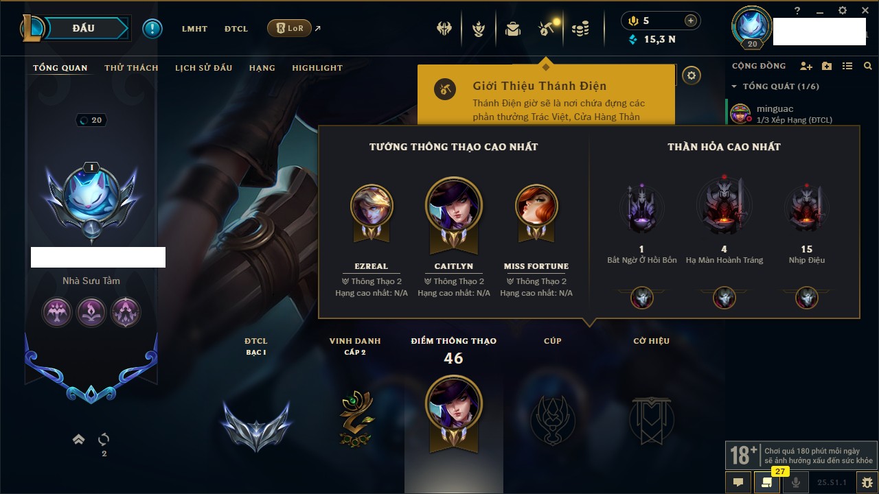 Rank Đơn: Vàng IIIKhung: BạcTướng: 56 - Còn 910 THXTrang Phục: 9Rank ĐTCL: Chưa RankLinh Thú: 31