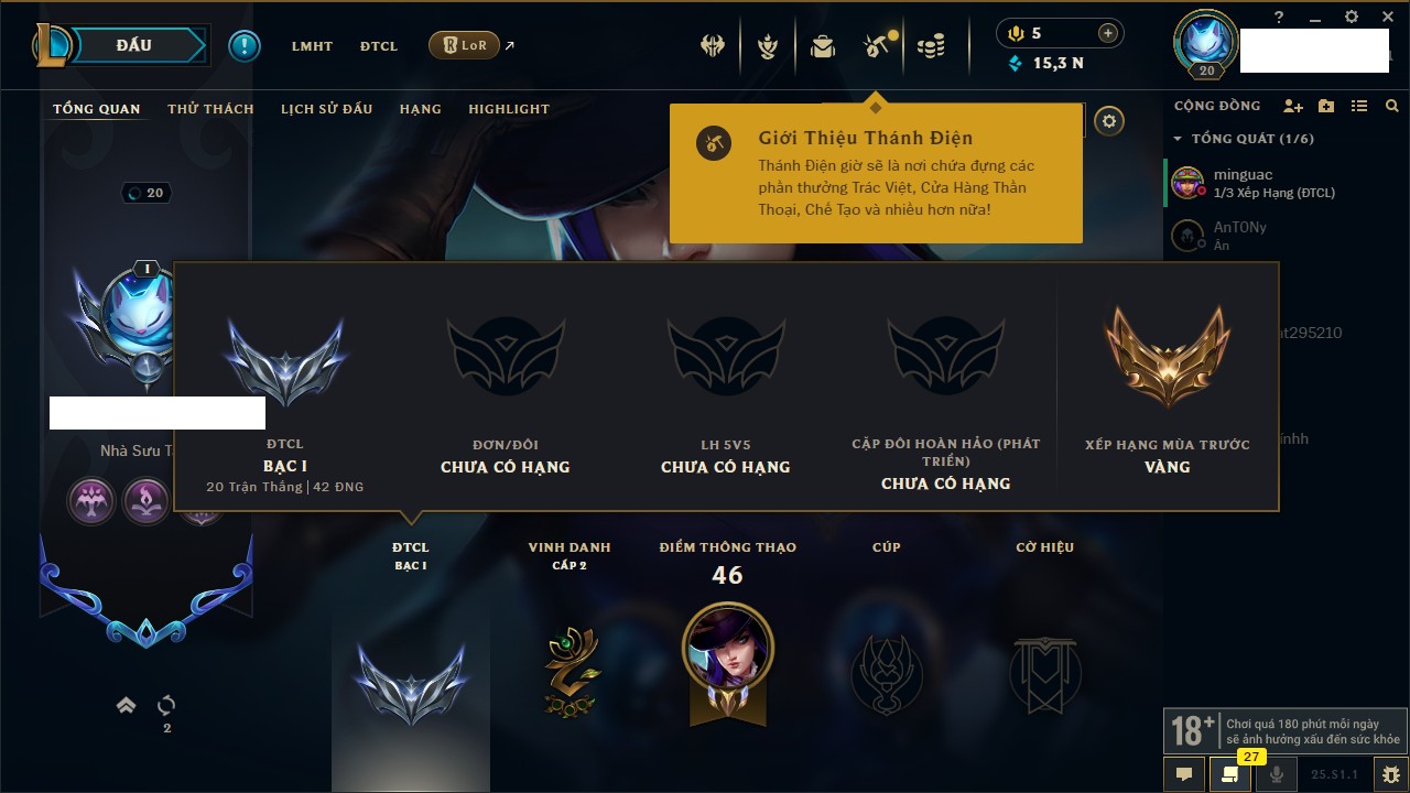 Rank Đơn: Vàng IIIKhung: VàngTướng: 77 - Còn 21172 THXTrang Phục: 8Rank ĐTCL: Kim Cương IIILinh Thú: 23
