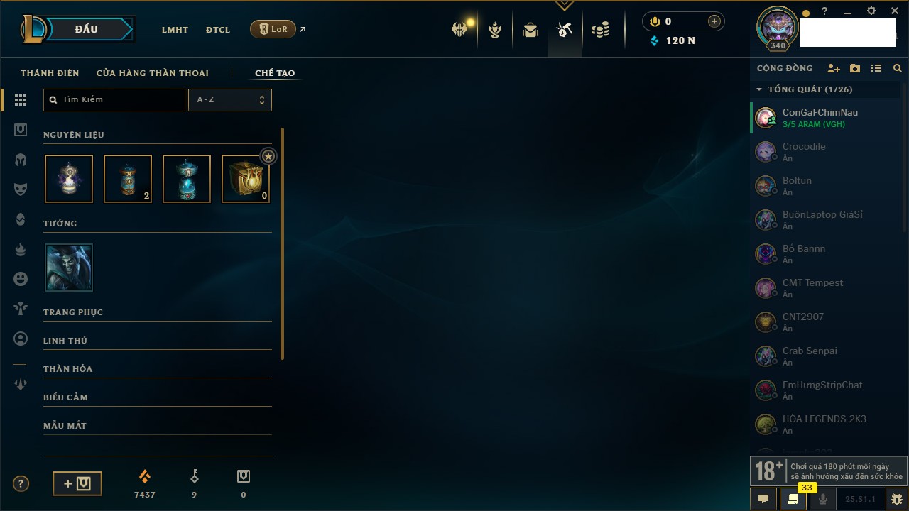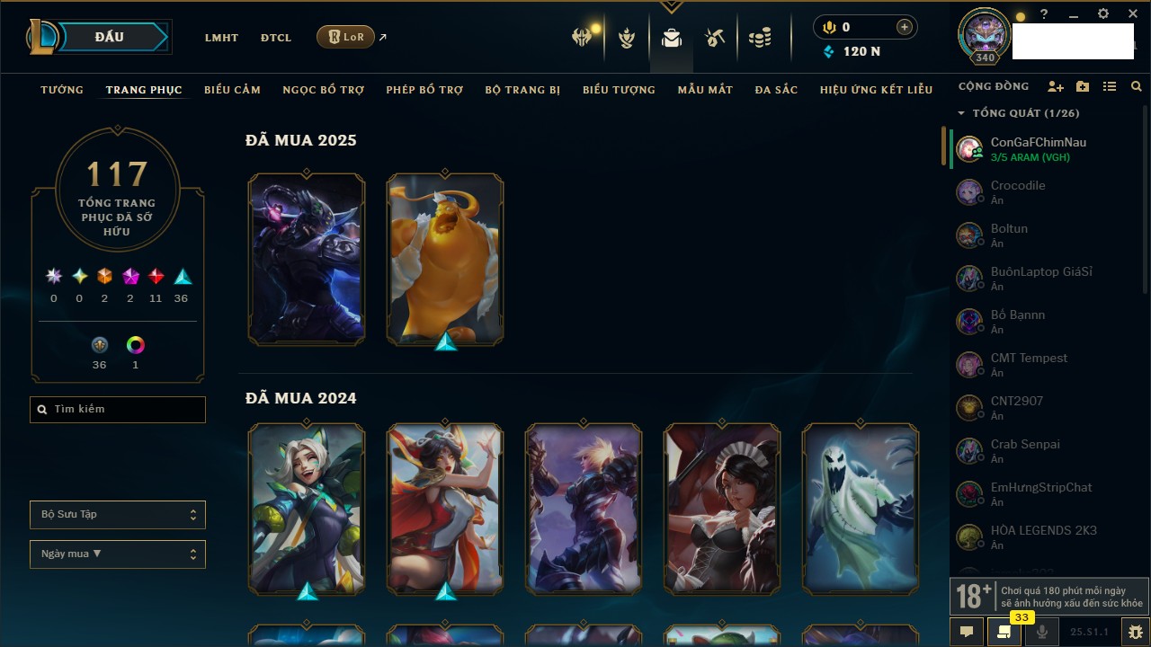 Rank Đơn: Đồng IIKhung: Chưa có khungTướng: 170 - Còn 56487 THXTrang Phục: 90Rank ĐTCL: Chưa RankLinh Thú: 129