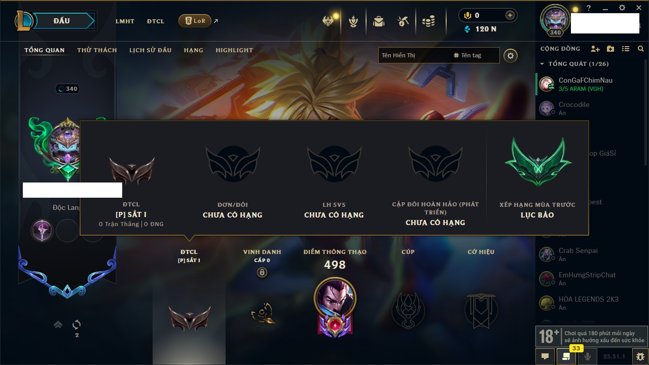 Rank Đơn: Đồng IIIKhung: ĐồngTướng: 171 - Còn 54778 THXTrang Phục: 96Rank ĐTCL: Bạch Kim IIILinh Thú: 140