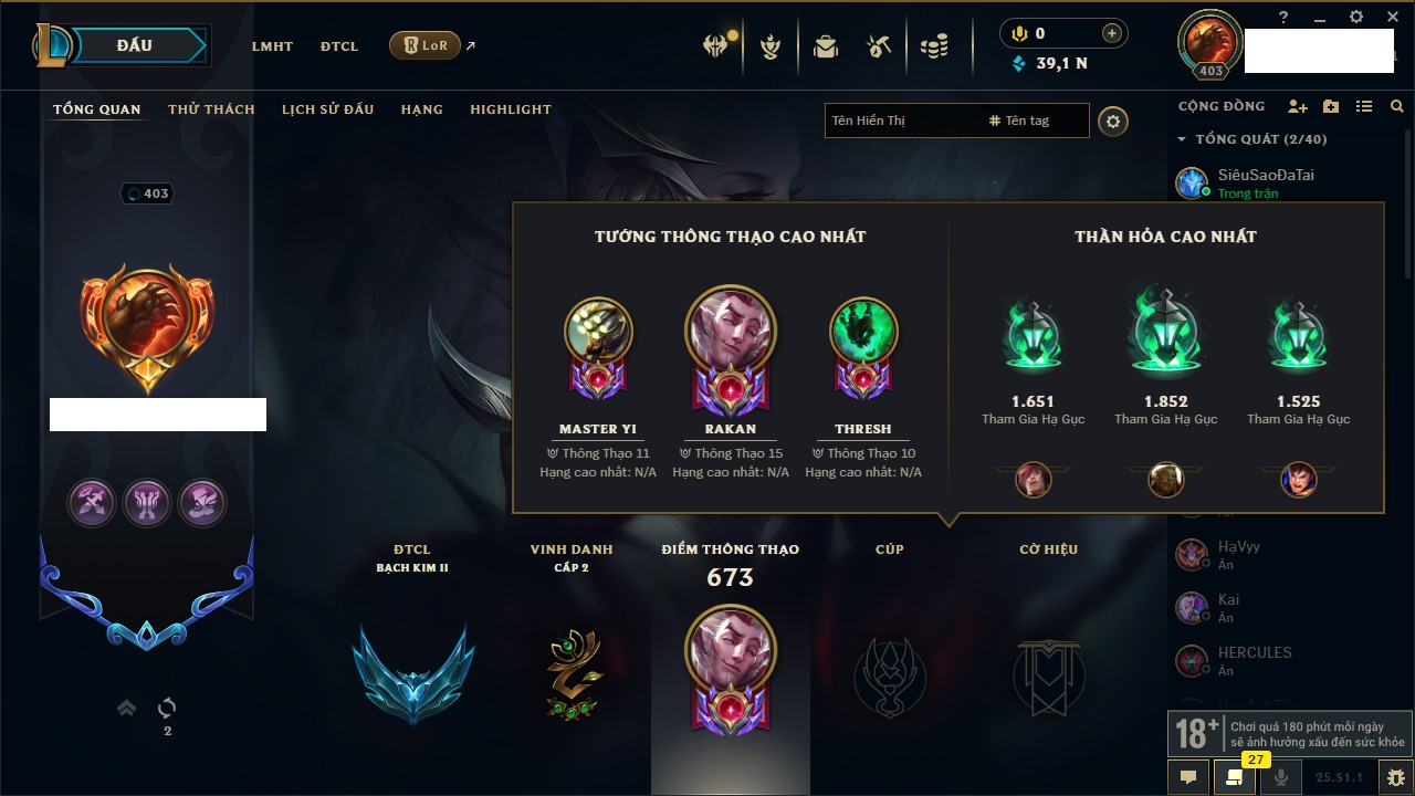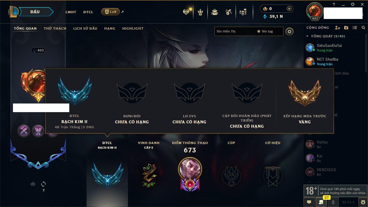 Rank Đơn: Vàng IIKhung: Bạch kimTướng: 172 - Còn 123420 THXTrang Phục: 231Rank ĐTCL: Bạch Kim IVLinh Thú: 213