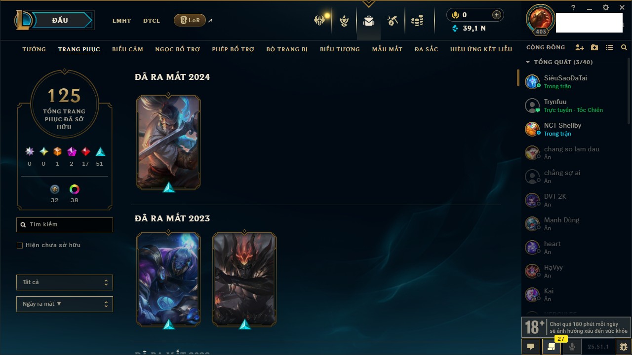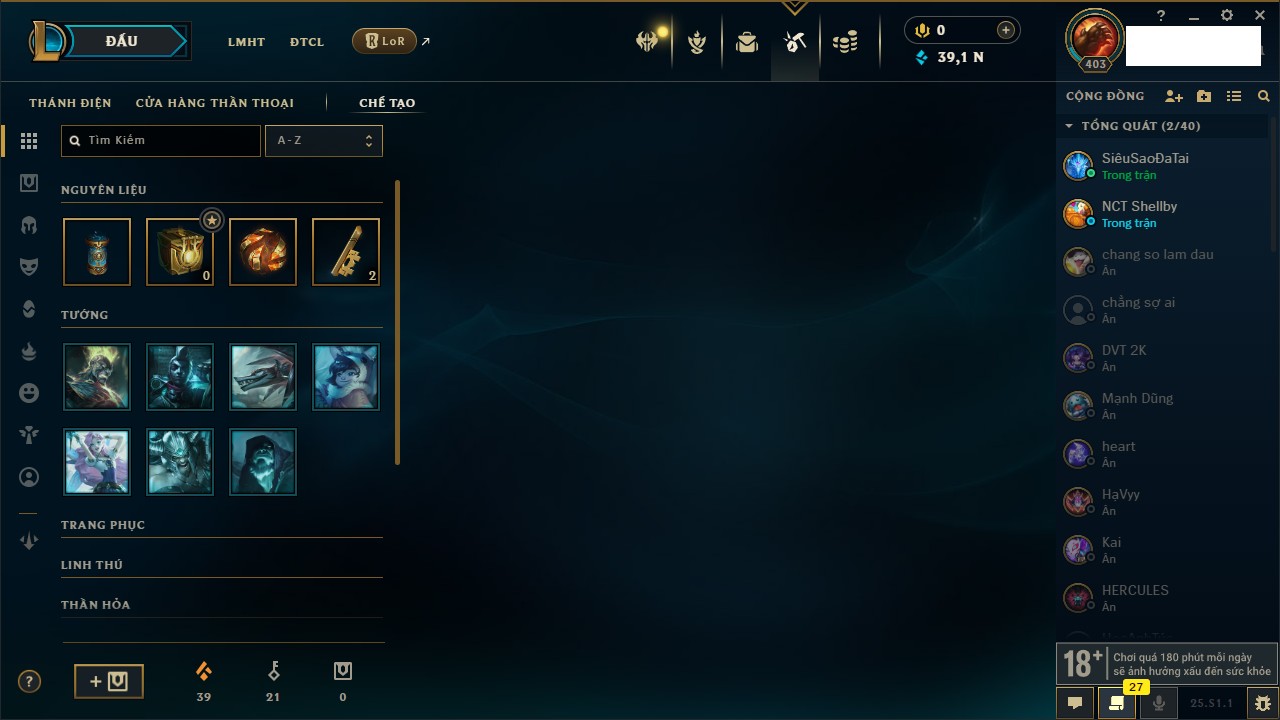 Rank Đơn: Vàng IIIKhung: VàngTướng: 172 - Còn 200315 THXTrang Phục: 87Rank ĐTCL: Chưa RankLinh Thú: 136