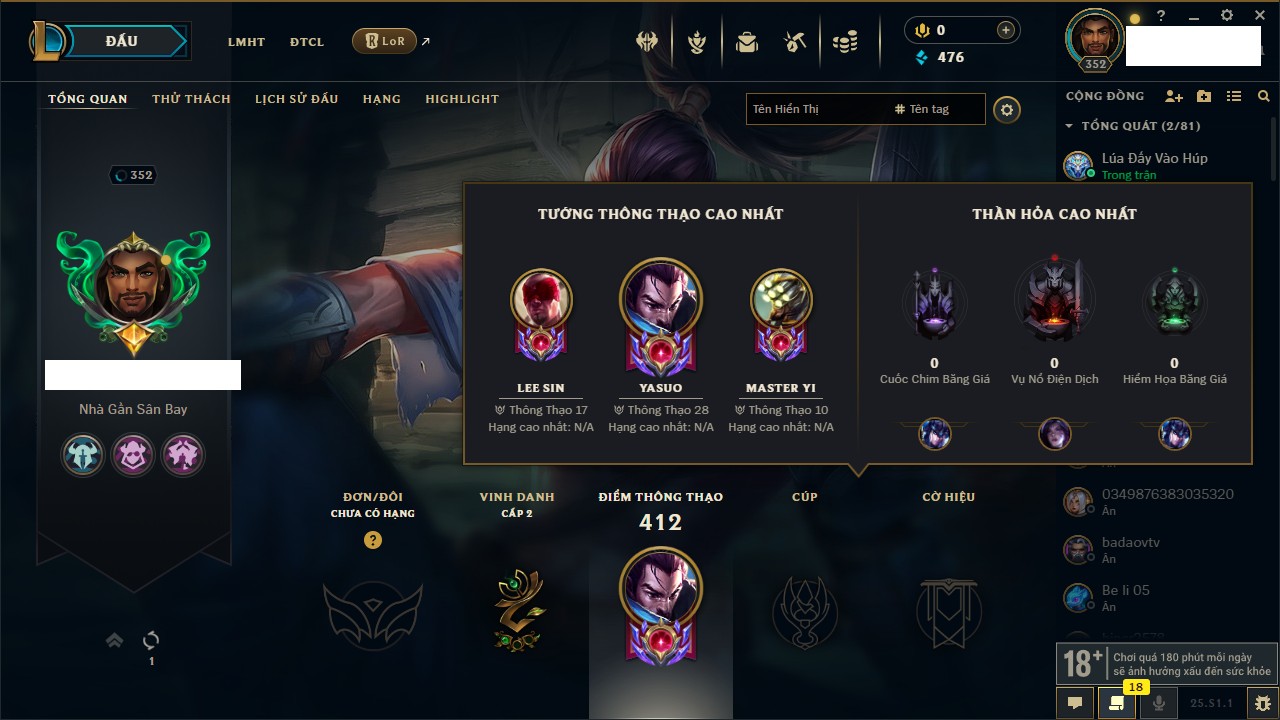 Rank Đơn: Bạch Kim IIKhung: Bạch kimTướng: 171 - Còn 316137 THXTrang Phục: 89Rank ĐTCL: Bạch Kim IIILinh Thú: 94
