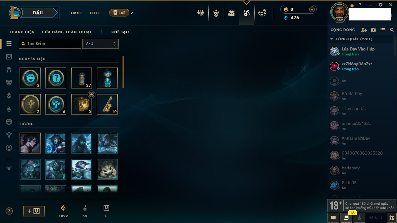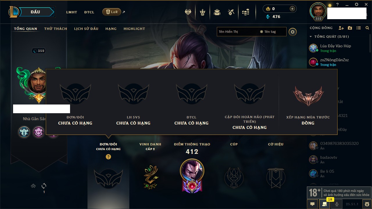 Rank Đơn: Vàng IIIKhung: VàngTướng: 172 - Còn 164704 THXTrang Phục: 255Rank ĐTCL: Kim Cương IVLinh Thú: 156