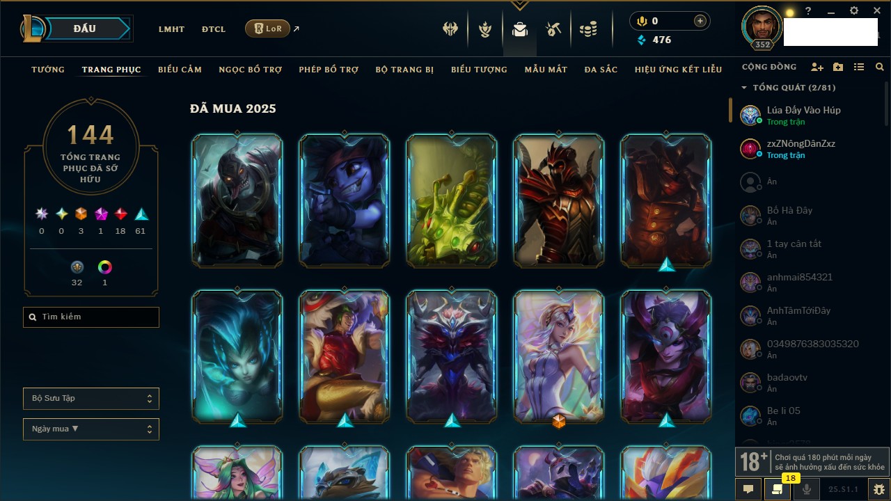 Rank Đơn: Vàng IIKhung: VàngTướng: 170 - Còn 243330 THXTrang Phục: 230Rank ĐTCL: Chưa RankLinh Thú: 68