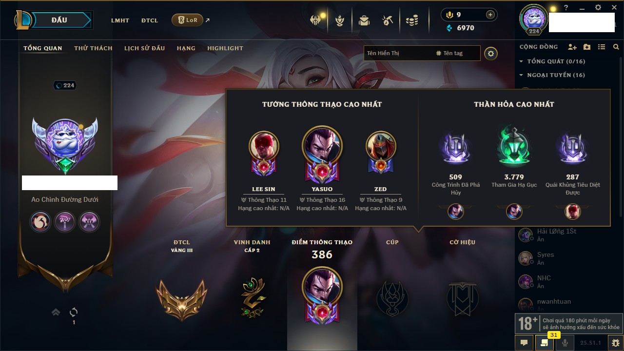 Rank Đơn: Vàng IIKhung: Chưa có khungTướng: 172 - Còn 18252 THXTrang Phục: 266Rank ĐTCL: Chưa RankLinh Thú: 79