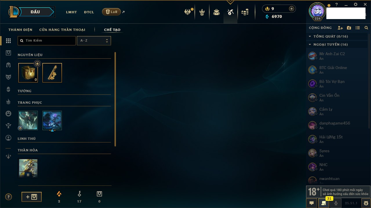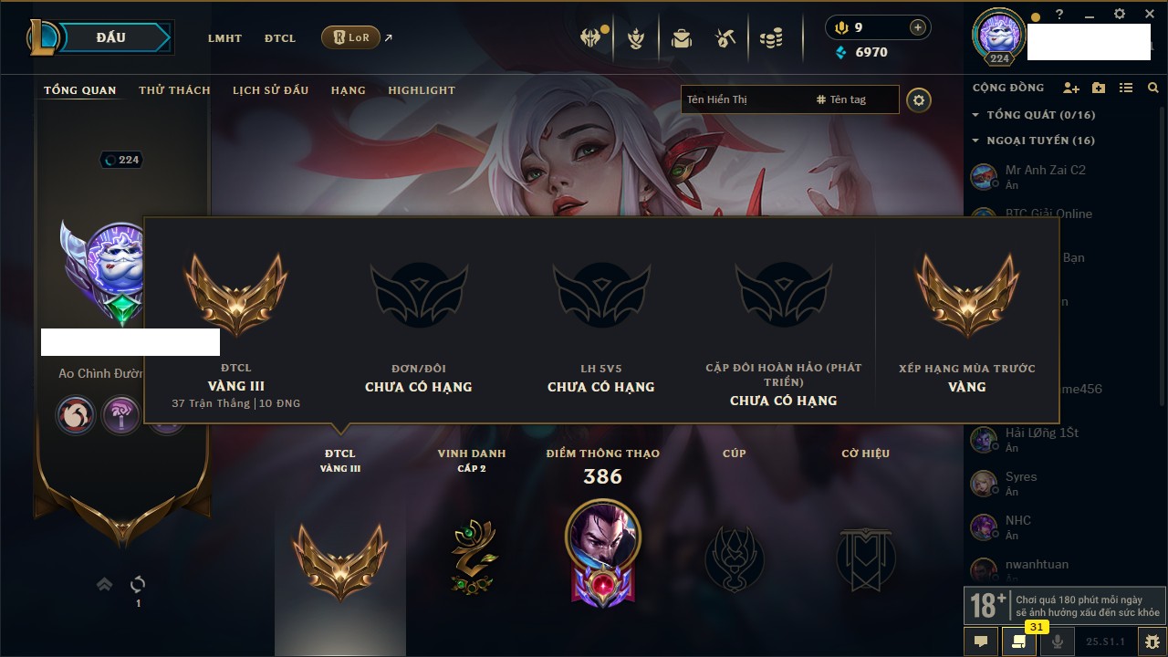 Rank Đơn: Vàng IIKhung: VàngTướng: 171 - Còn 34018 THXTrang Phục: 250Rank ĐTCL: Sắt IILinh Thú: 19