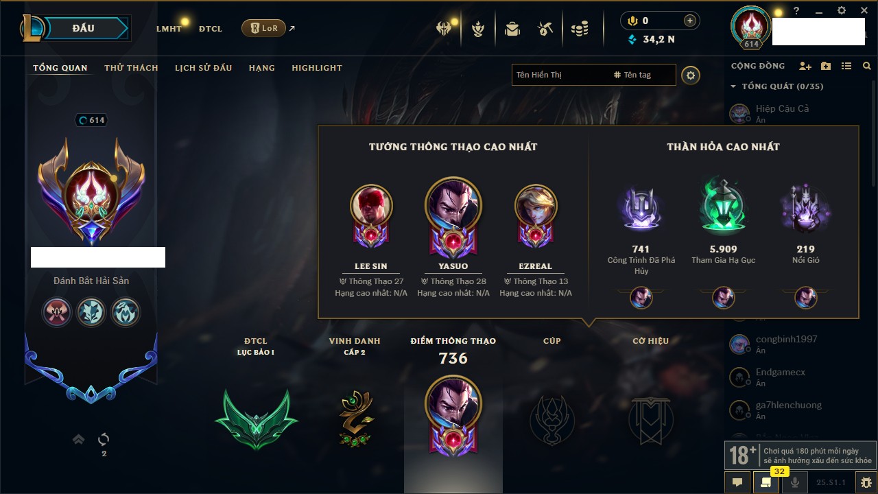 Rank Đơn: Vàng IIIKhung: VàngTướng: 171 - Còn 88128 THXTrang Phục: 329Rank ĐTCL: Chưa RankLinh Thú: 41