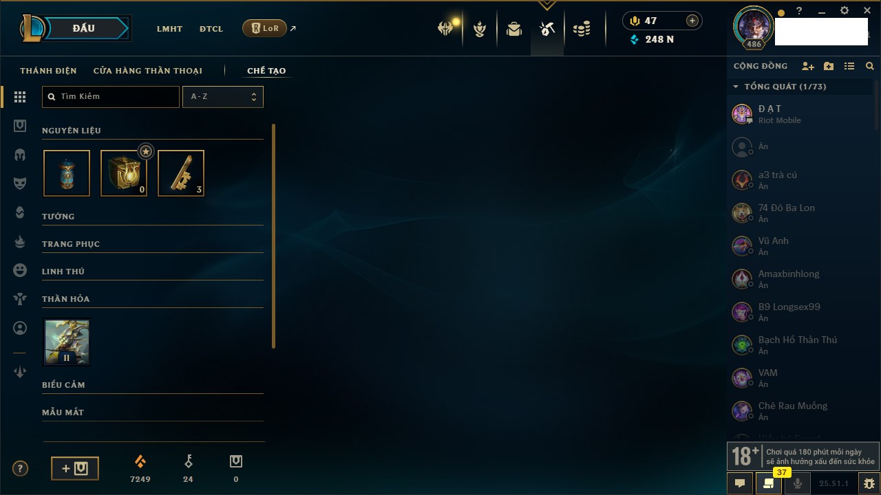 Rank Đơn: Chưa RankKhung: VàngTướng: 171 - Còn 489498 THXTrang Phục: 263Rank ĐTCL: Chưa RankLinh Thú: 39