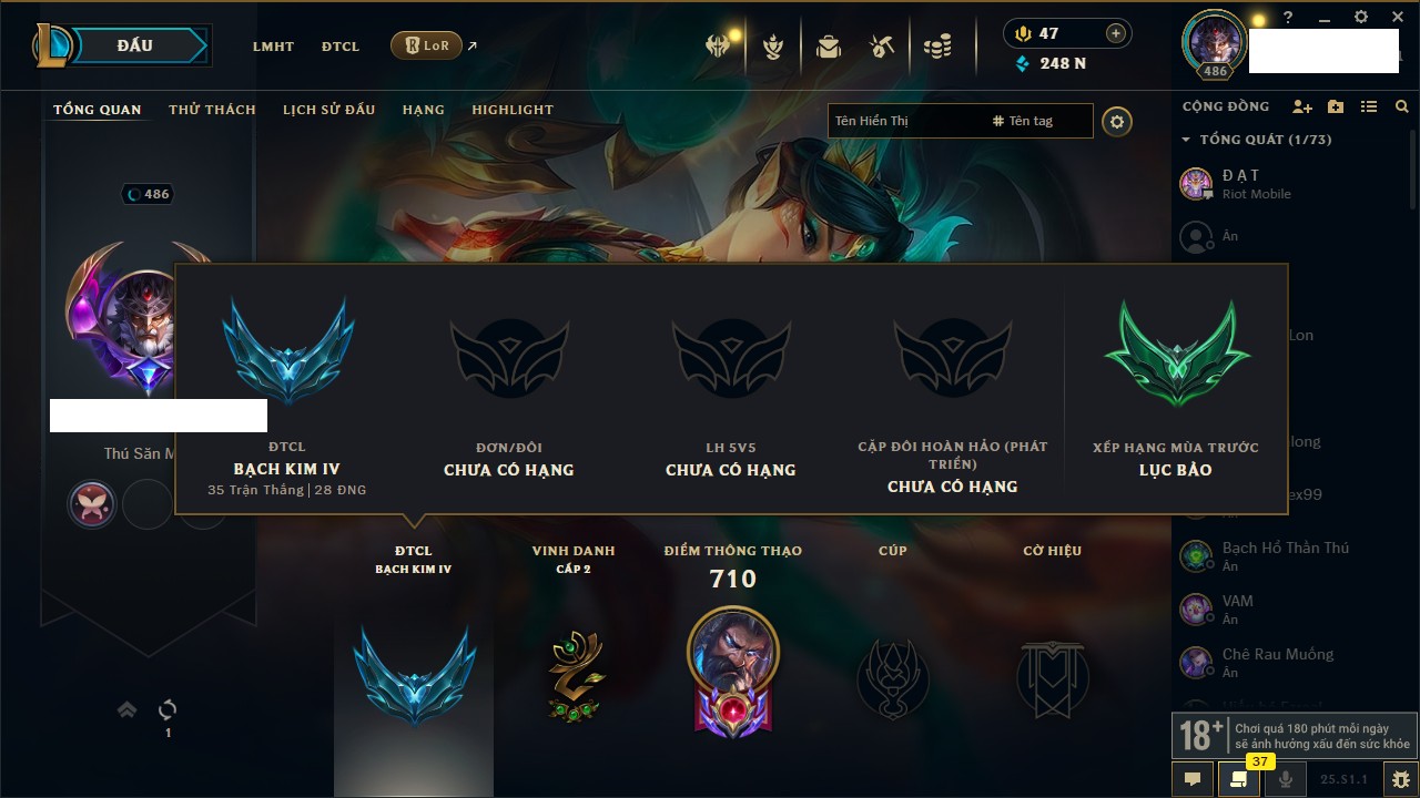 Rank Đơn: Bạch Kim IKhung: Chưa có khungTướng: 157 - Còn 261795 THXTrang Phục: 173Rank ĐTCL: Chưa RankLinh Thú: 14