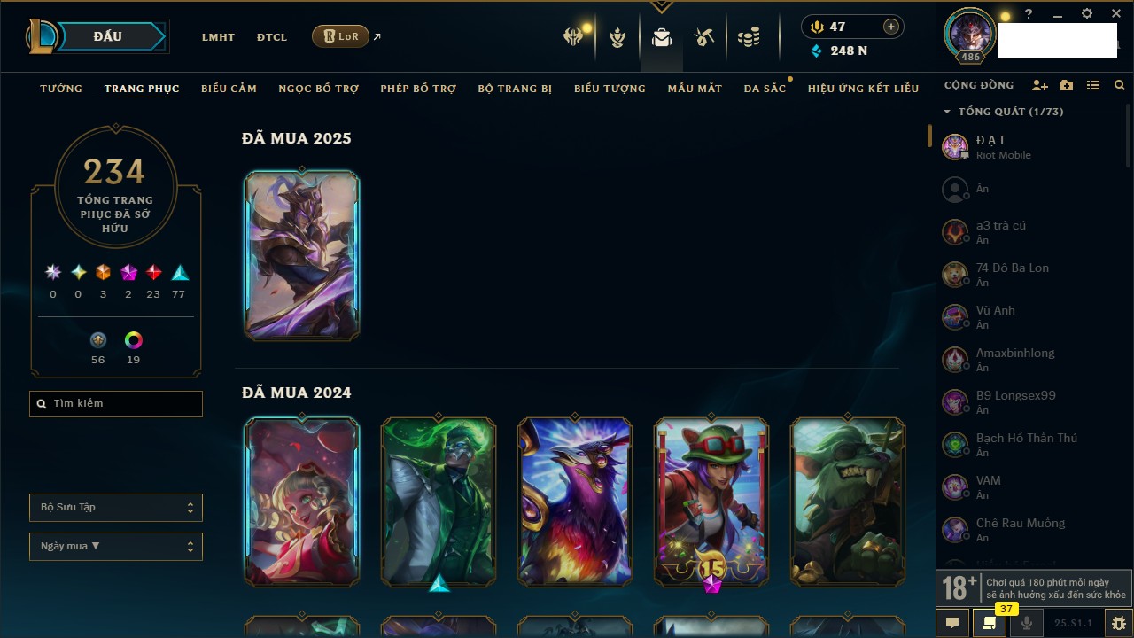 Rank Đơn: Chưa RankKhung: Chưa có khungTướng: 157 - Còn 2008 THXTrang Phục: 206Rank ĐTCL: Chưa RankLinh Thú: 29