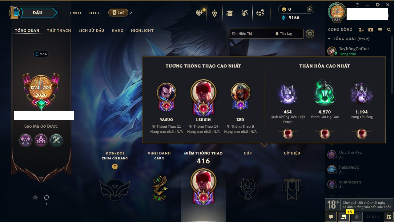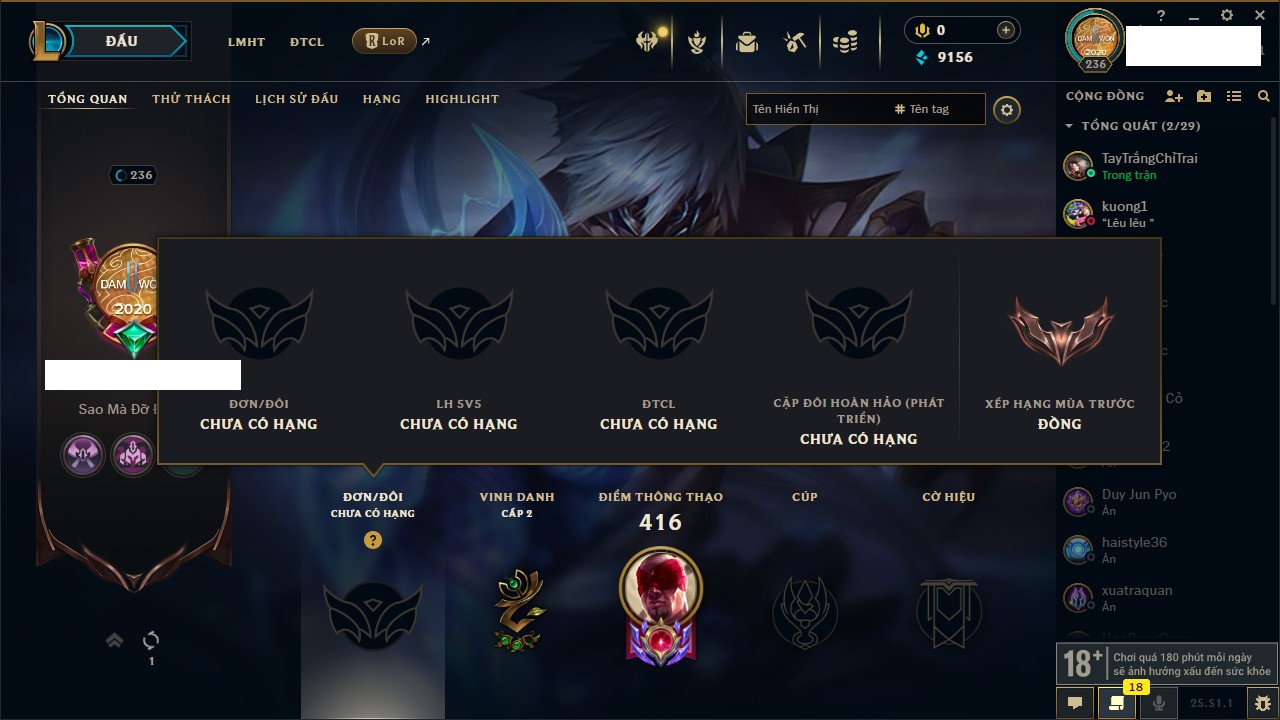 Rank Đơn: Đồng IIKhung: ĐồngTướng: 170 - Còn 66145 THXTrang Phục: 215Rank ĐTCL: Chưa RankLinh Thú: 52