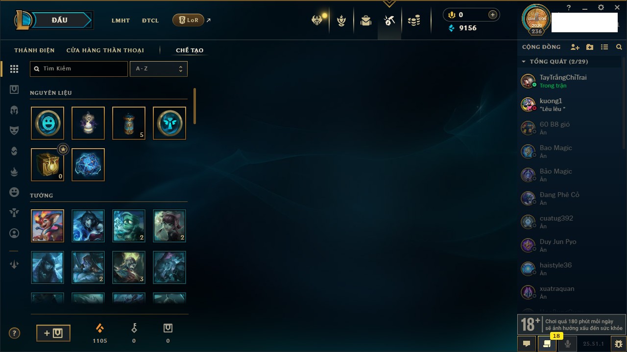 Rank Đơn: Vàng IIIKhung: BạcTướng: 171 - Còn 101359 THXTrang Phục: 88Rank ĐTCL: Kim Cương IVLinh Thú: 200