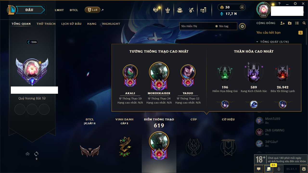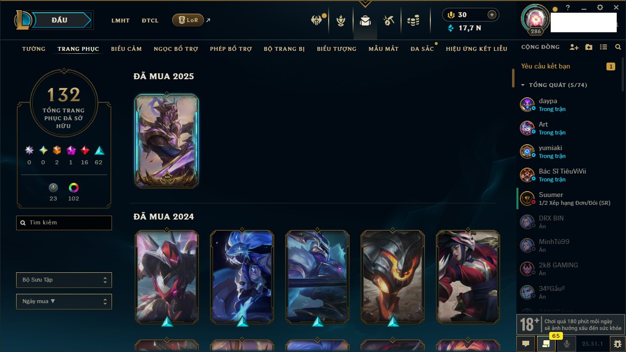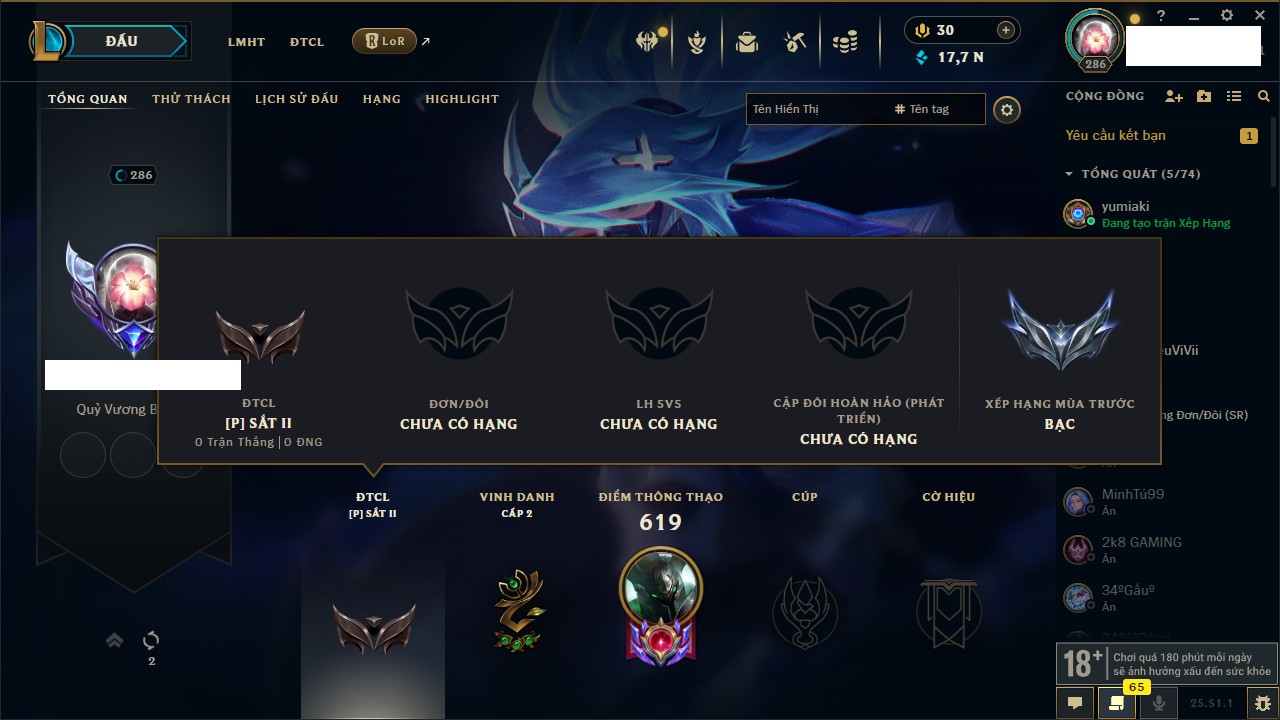 Rank Đơn: Đồng IIKhung: Chưa có khungTướng: 170 - Còn 56487 THXTrang Phục: 90Rank ĐTCL: Chưa RankLinh Thú: 129