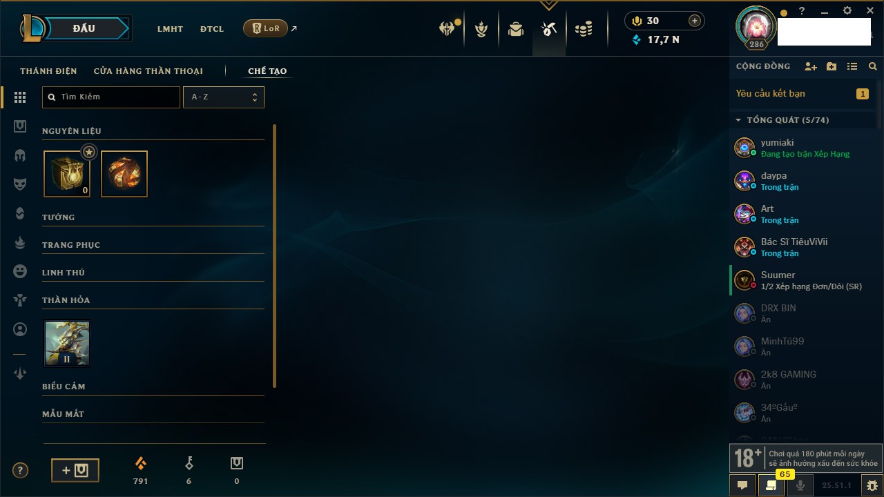 Rank Đơn: Chưa RankKhung: Chưa có khungTướng: 157 - Còn 6783 THXTrang Phục: 50Rank ĐTCL: Chưa RankLinh Thú: 37