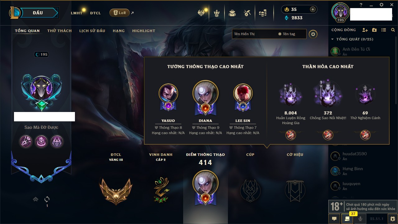Rank Đơn: Chưa RankKhung: Bạch kimTướng: 172 - Còn 81 THXTrang Phục: 226Rank ĐTCL: Chưa RankLinh Thú: 193