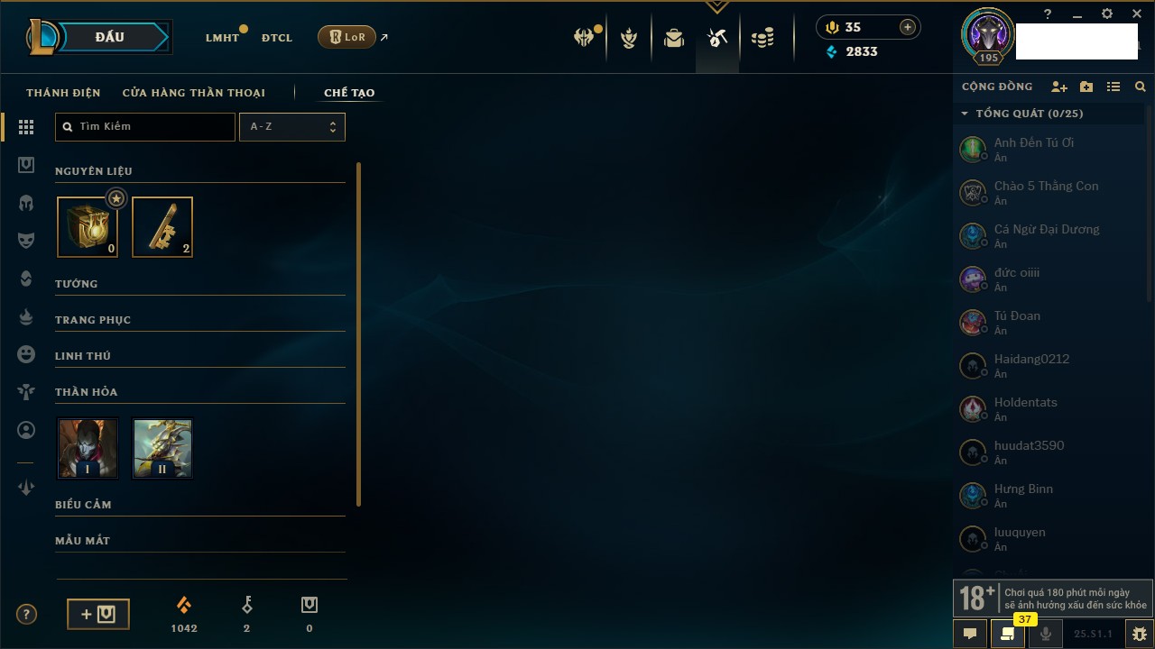 Rank Đơn: Chưa RankKhung: Bạch kimTướng: 170 - Còn 146400 THXTrang Phục: 225Rank ĐTCL: Chưa RankLinh Thú: 134