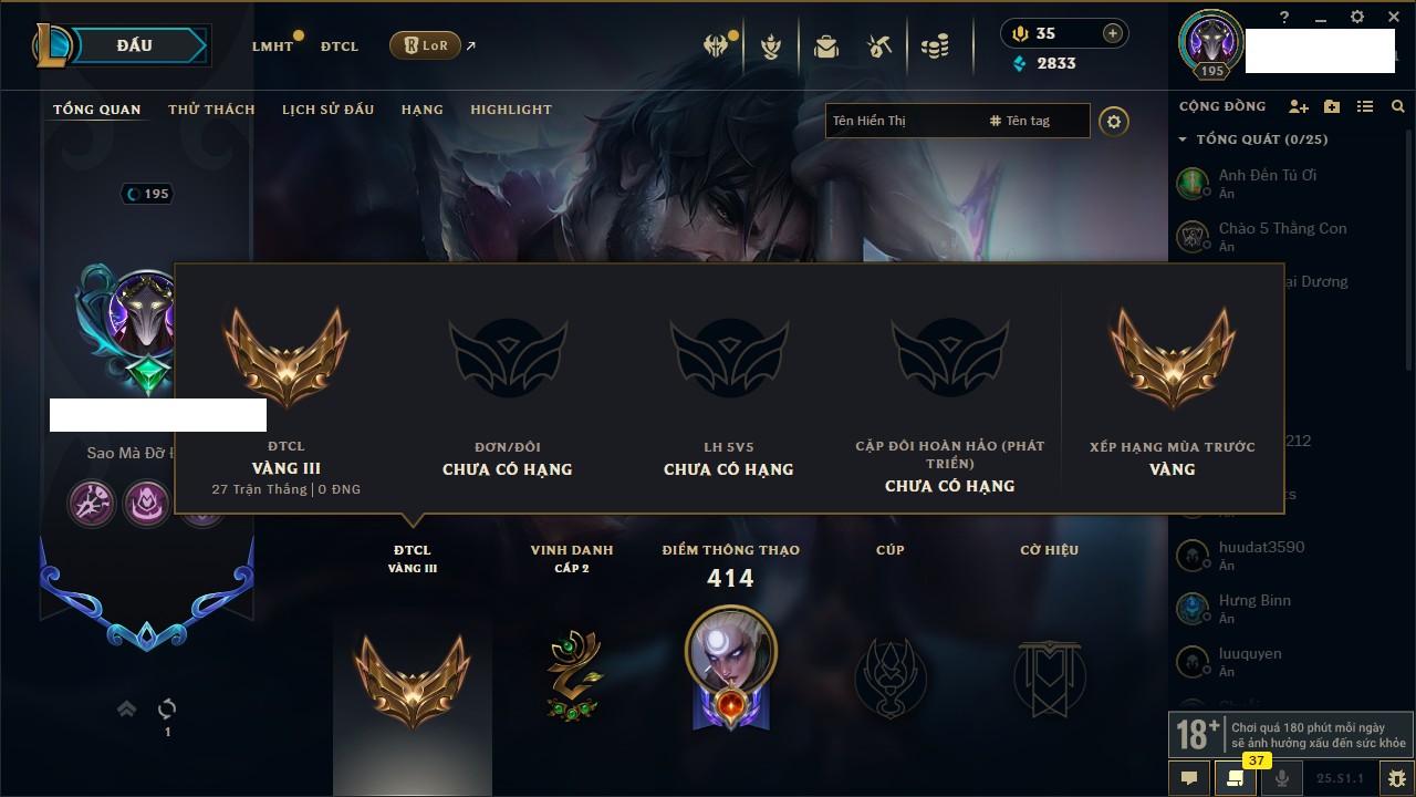 Rank Đơn: Chưa RankKhung: VàngTướng: 171 - Còn 489498 THXTrang Phục: 263Rank ĐTCL: Chưa RankLinh Thú: 39