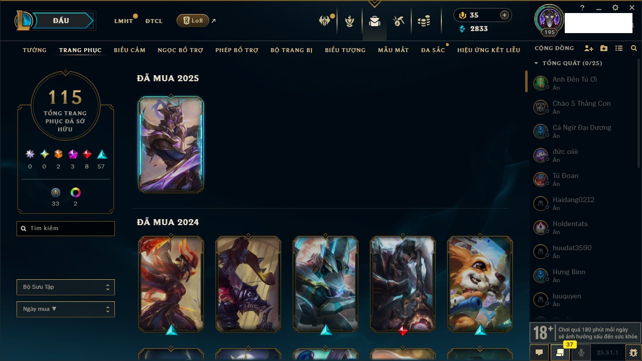 Rank Đơn: Chưa RankKhung: Chưa có khungTướng: 157 - Còn 2008 THXTrang Phục: 206Rank ĐTCL: Chưa RankLinh Thú: 29