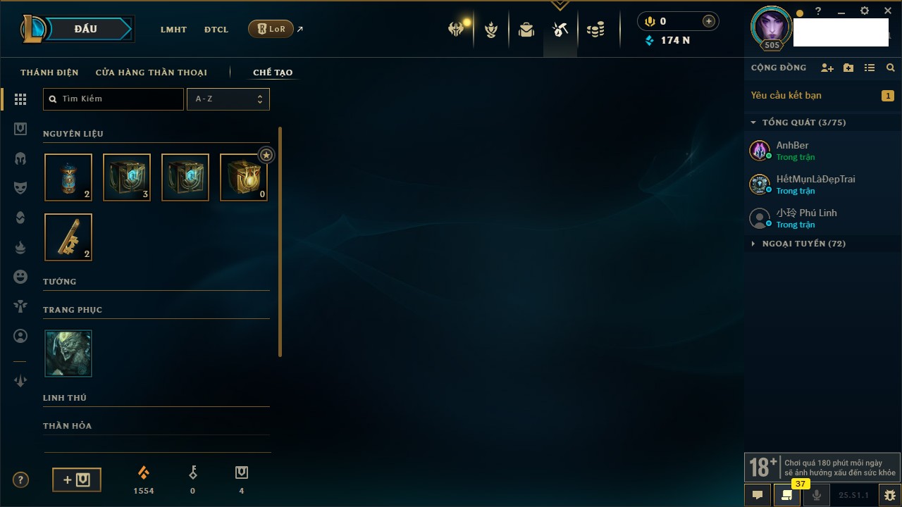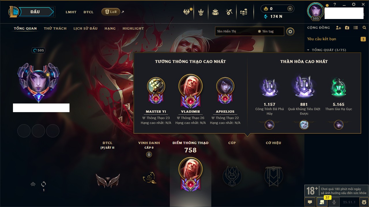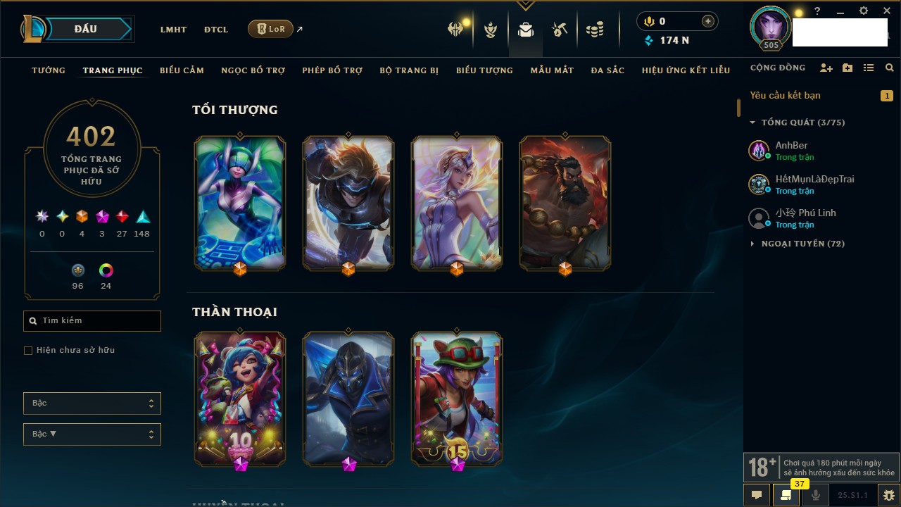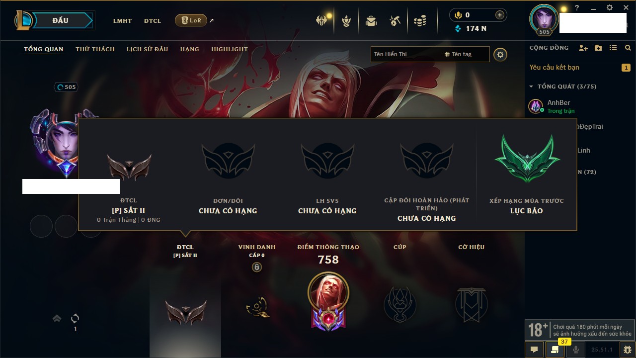 Rank Đơn: Chưa RankKhung: Bạch kimTướng: 169 - Còn 174456 THXTrang Phục: 402Rank ĐTCL: Chưa RankLinh Thú: 49