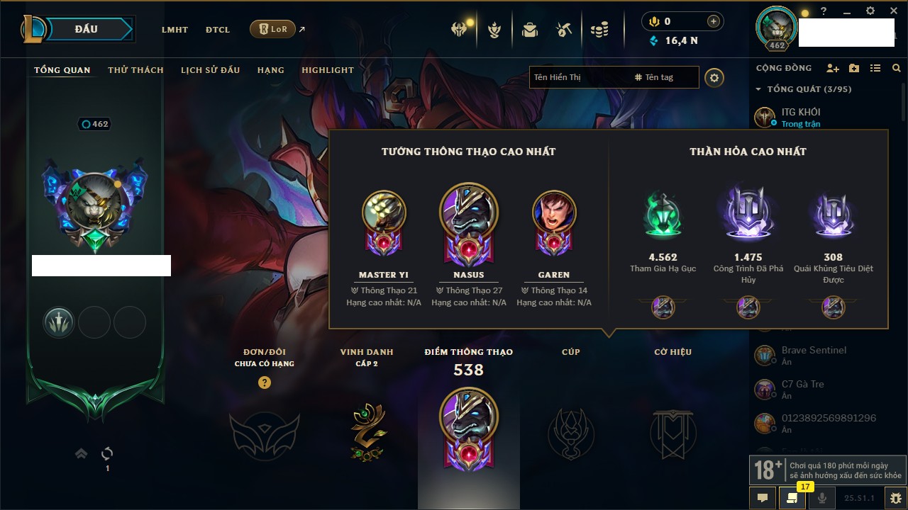 Rank Đơn: Chưa RankKhung: Chưa có khungTướng: 157 - Còn 6783 THXTrang Phục: 50Rank ĐTCL: Chưa RankLinh Thú: 37