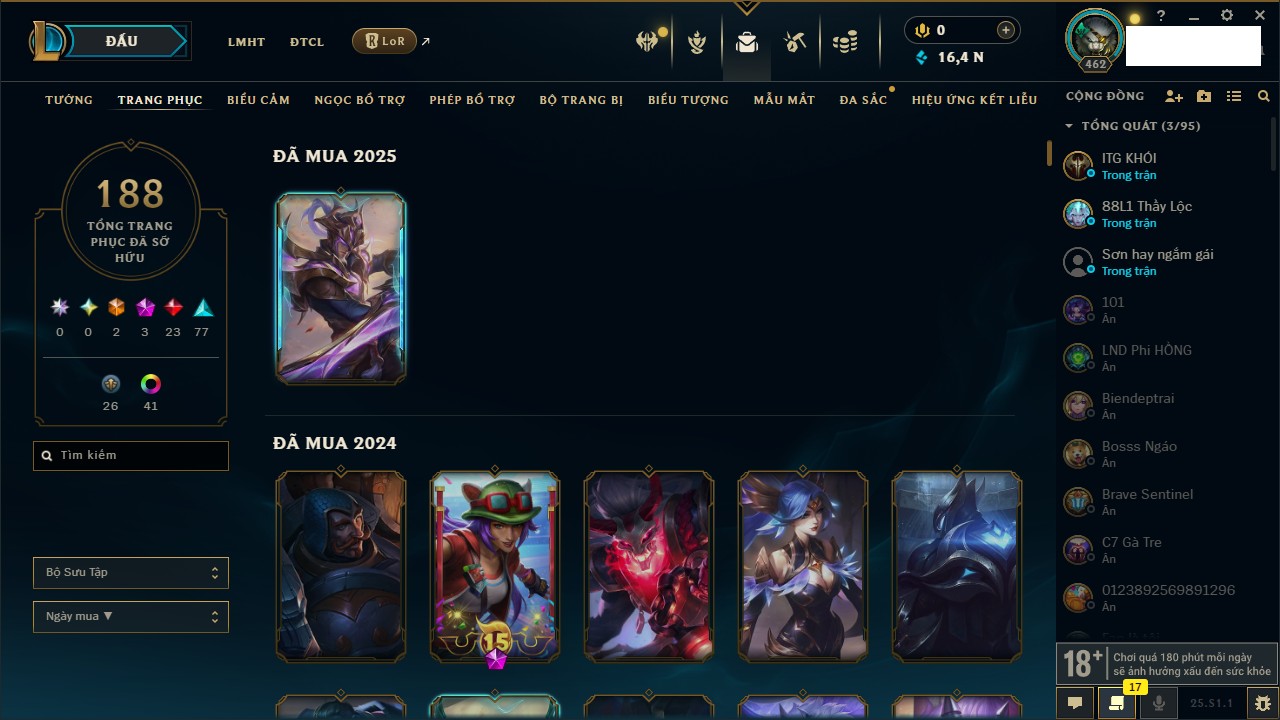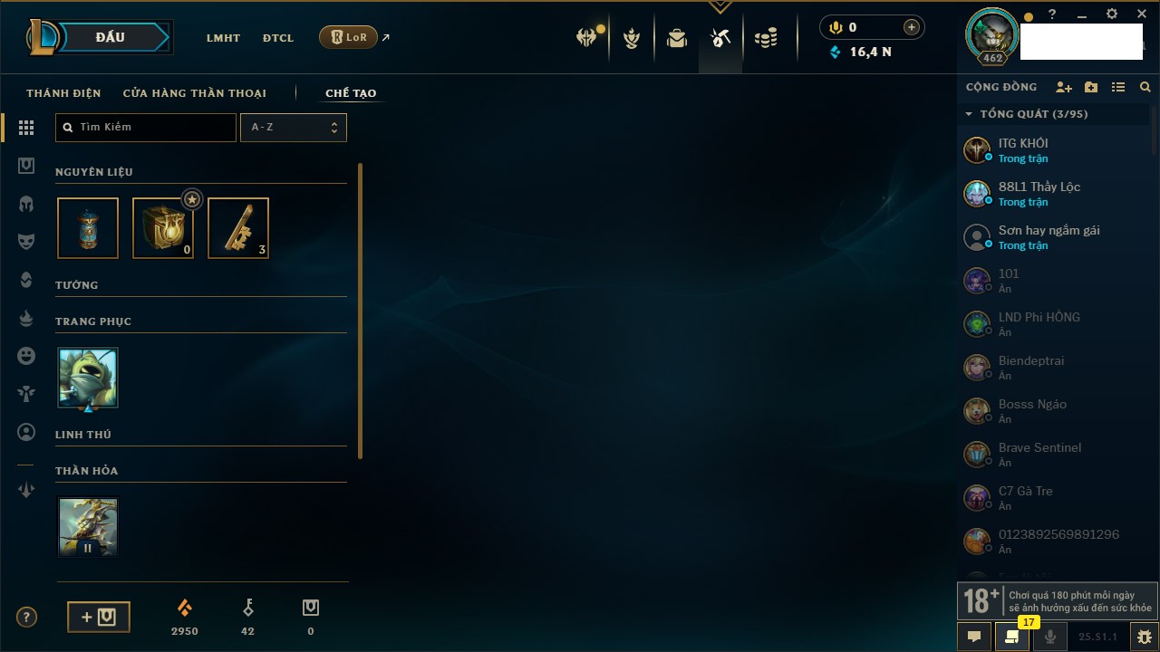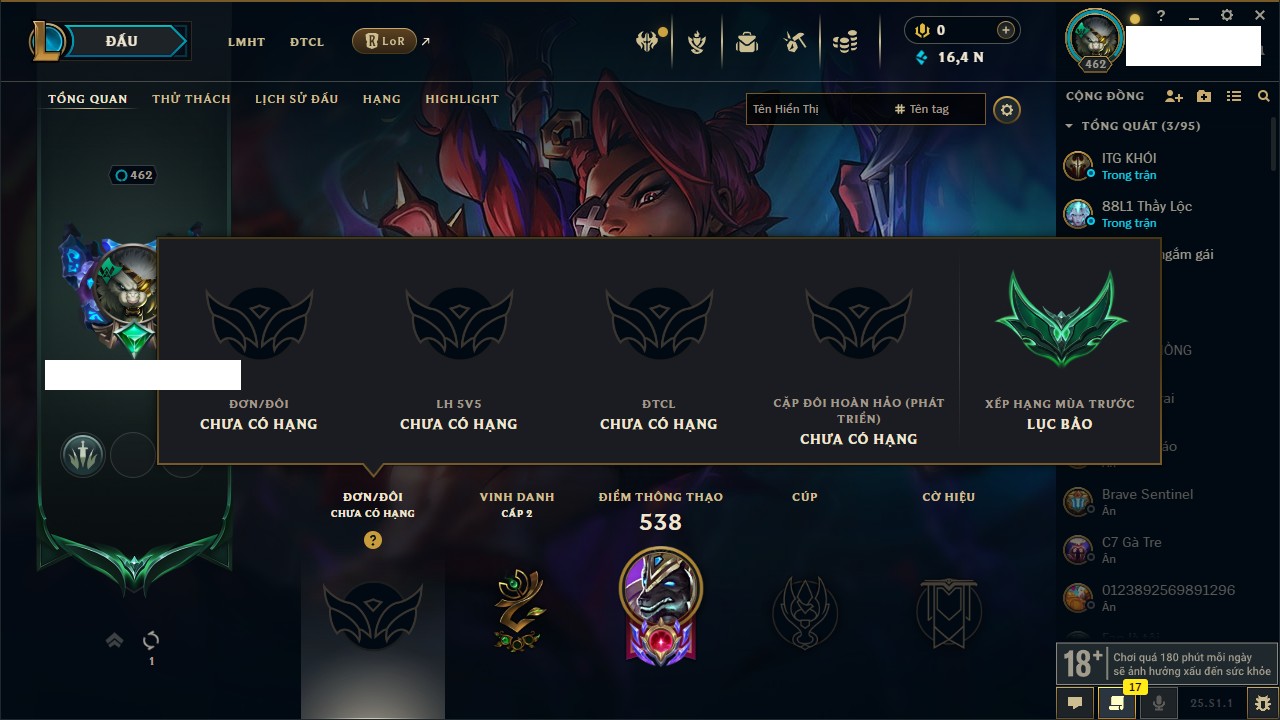 Rank Đơn: Đồng IIKhung: Chưa có khungTướng: 170 - Còn 56487 THXTrang Phục: 90Rank ĐTCL: Chưa RankLinh Thú: 129