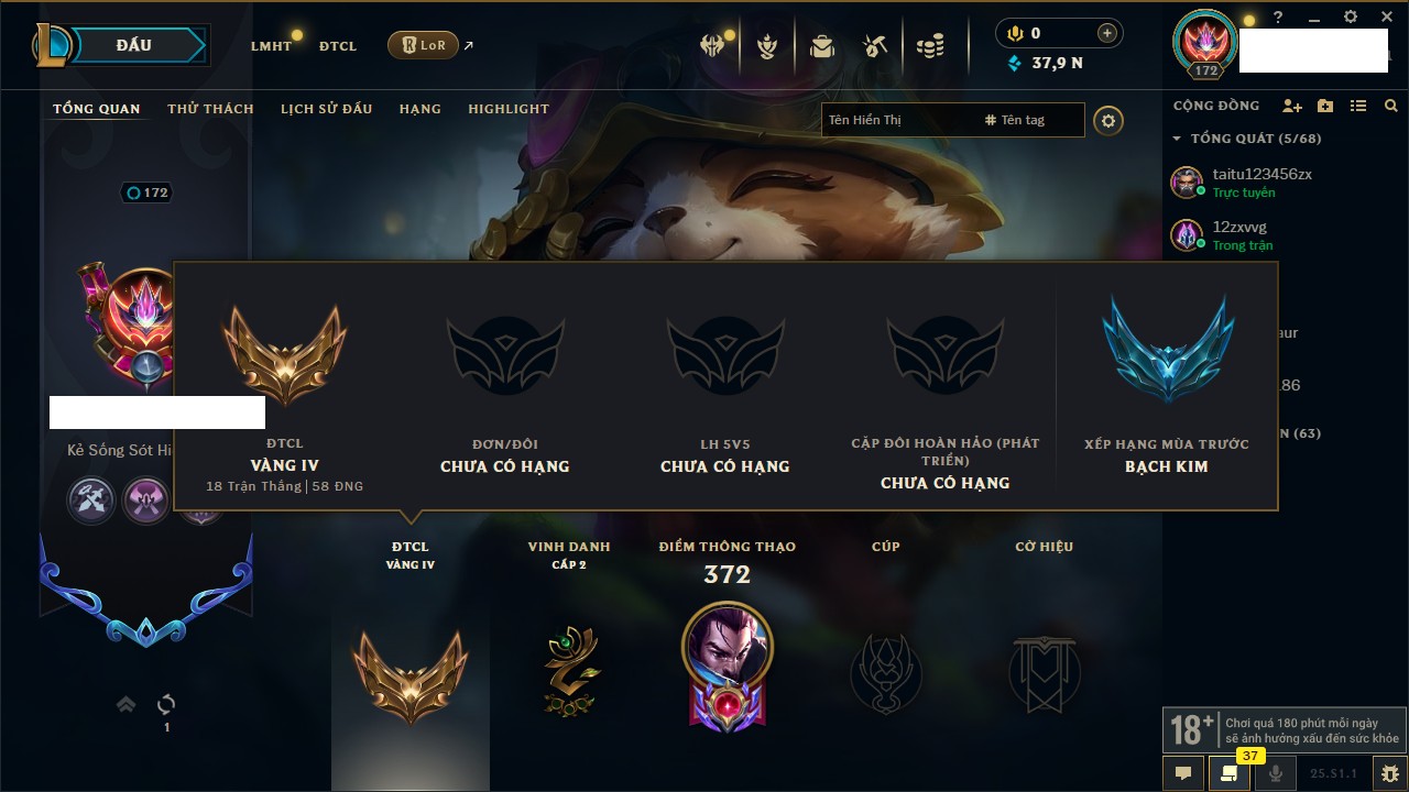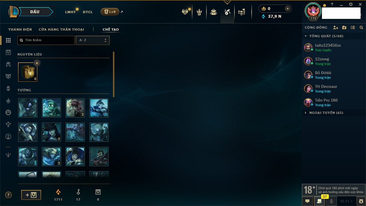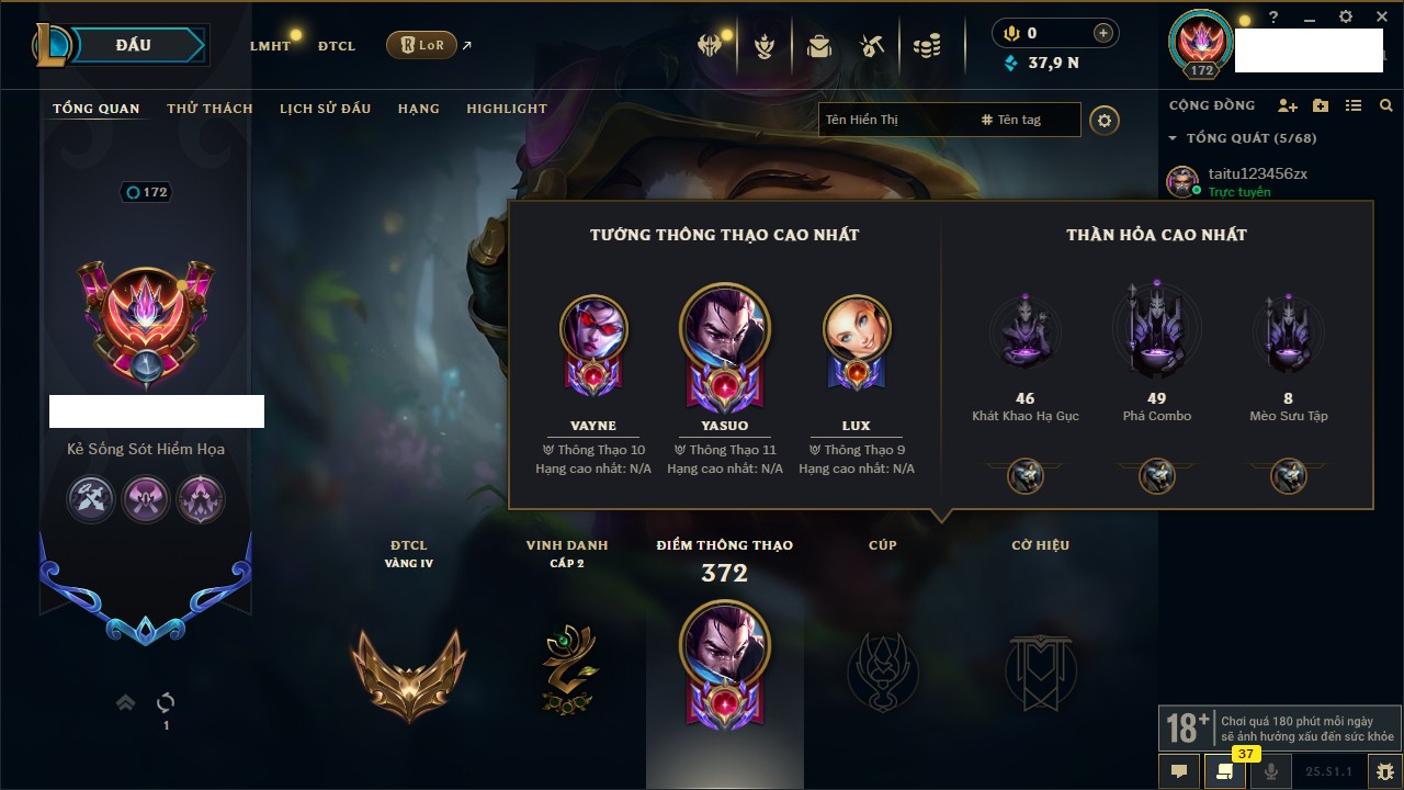 Rank Đơn: Đồng IIKhung: Chưa có khungTướng: 153 - Còn 32832 THXTrang Phục: 66Rank ĐTCL: Chưa RankLinh Thú: 7