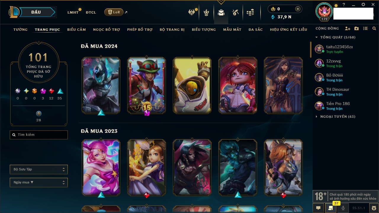 Rank Đơn: Chưa RankKhung: Chưa có khungTướng: 163 - Còn 37947 THXTrang Phục: 101Rank ĐTCL: Chưa RankLinh Thú: 83