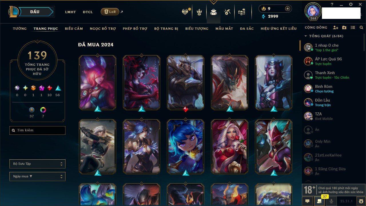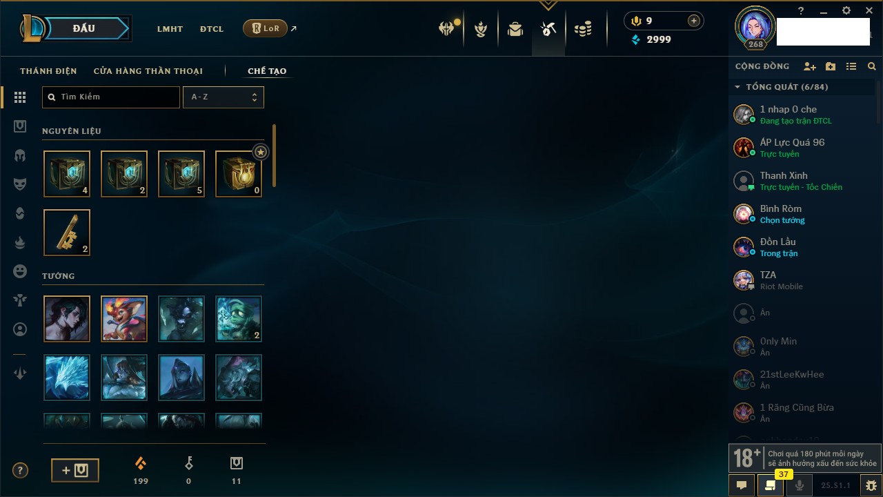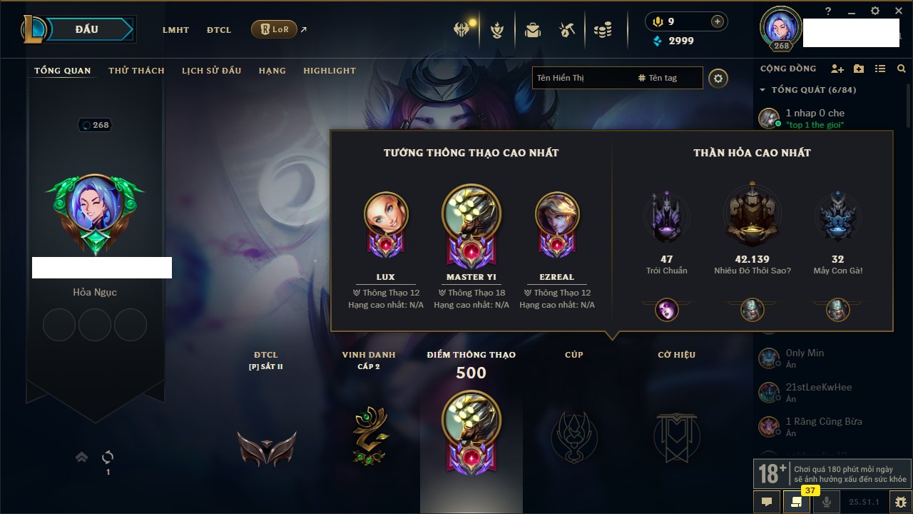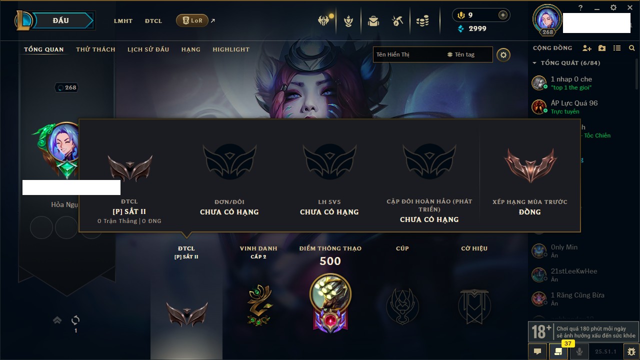 Rank Đơn: Đồng IIKhung: Chưa có khungTướng: 153 - Còn 32832 THXTrang Phục: 66Rank ĐTCL: Chưa RankLinh Thú: 7