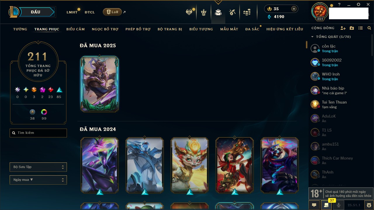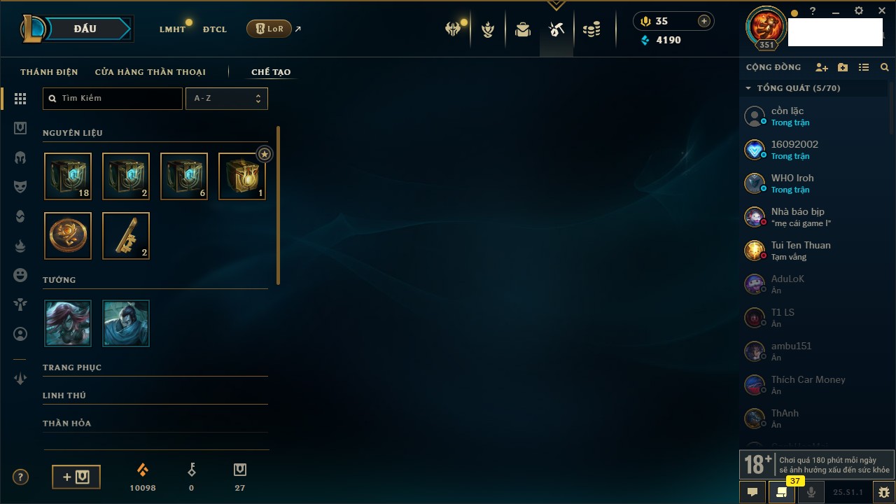 Rank Đơn: Bạc IIIKhung: BạcTướng: 171 - Còn 51045 THXTrang Phục: 220Rank ĐTCL: Sắt IILinh Thú: 141