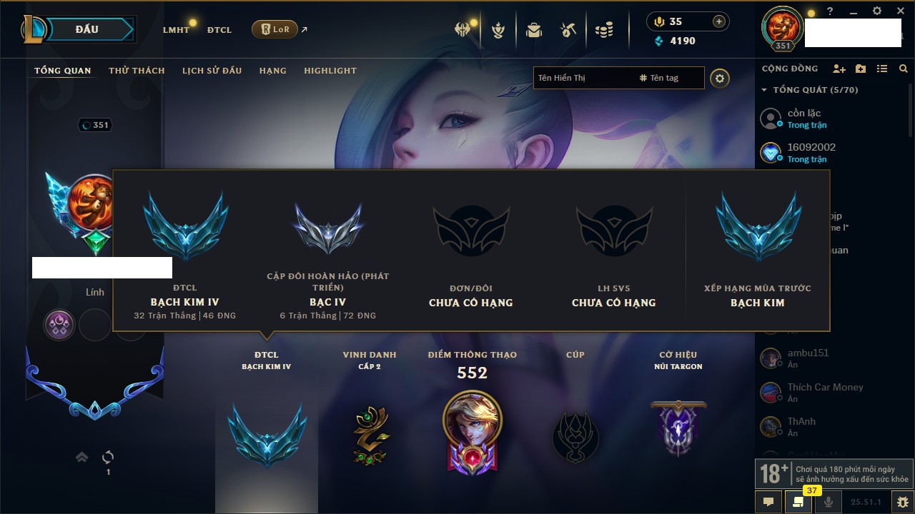 Rank Đơn: Bạch Kim IIKhung: VàngTướng: 171 - Còn 140736 THXTrang Phục: 182Rank ĐTCL: Chưa RankLinh Thú: 14
