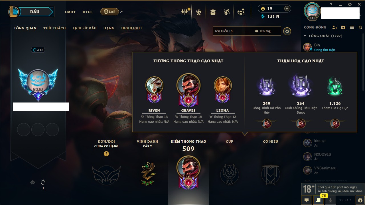Rank Đơn: Chưa RankKhung: Chưa có khungTướng: 148 - Còn 2211 THXTrang Phục: 97Rank ĐTCL: Chưa RankLinh Thú: 77