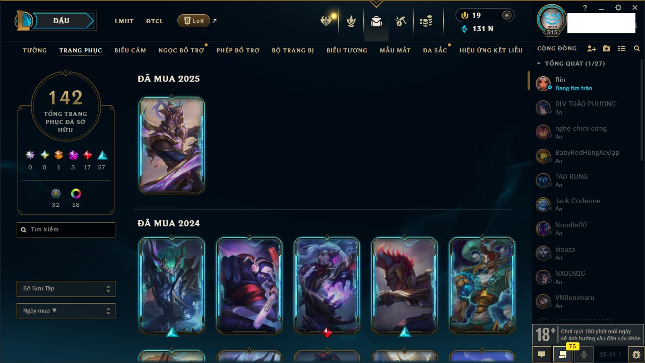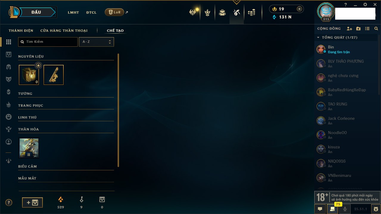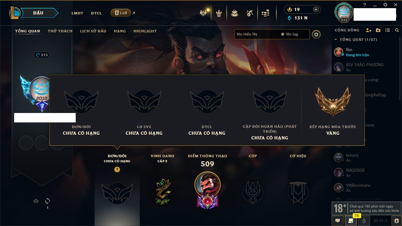 Rank Đơn: Chưa RankKhung: VàngTướng: 170 - Còn 37719 THXTrang Phục: 138Rank ĐTCL: Chưa RankLinh Thú: 65