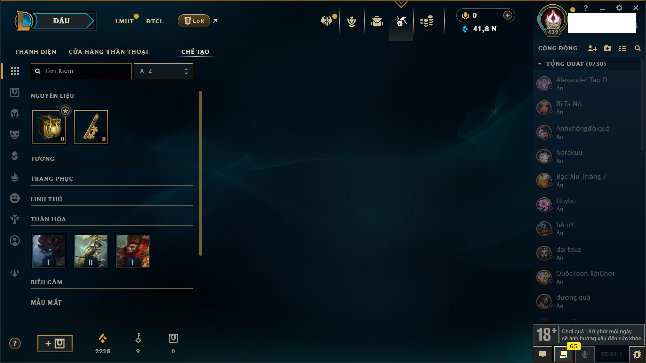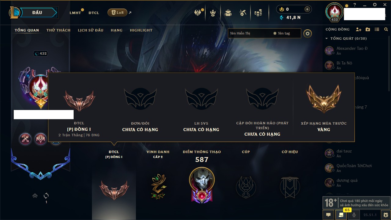 Rank Đơn: Đồng IKhung: Chưa có khungTướng: 130 - Còn 4038 THXTrang Phục: 151Rank ĐTCL: Chưa RankLinh Thú: 45