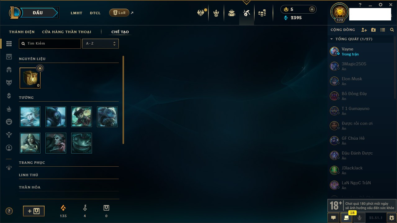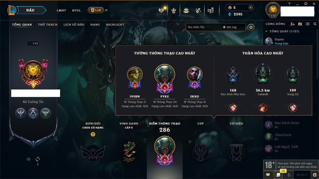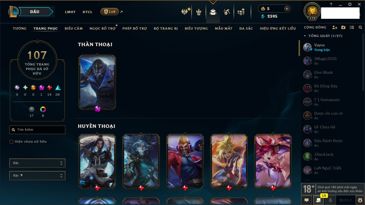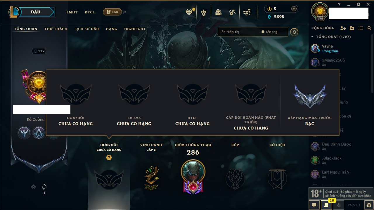 Rank Đơn: Chưa RankKhung: Chưa có khungTướng: 170 - Còn 295614 THXTrang Phục: 137Rank ĐTCL: Chưa RankLinh Thú: 109