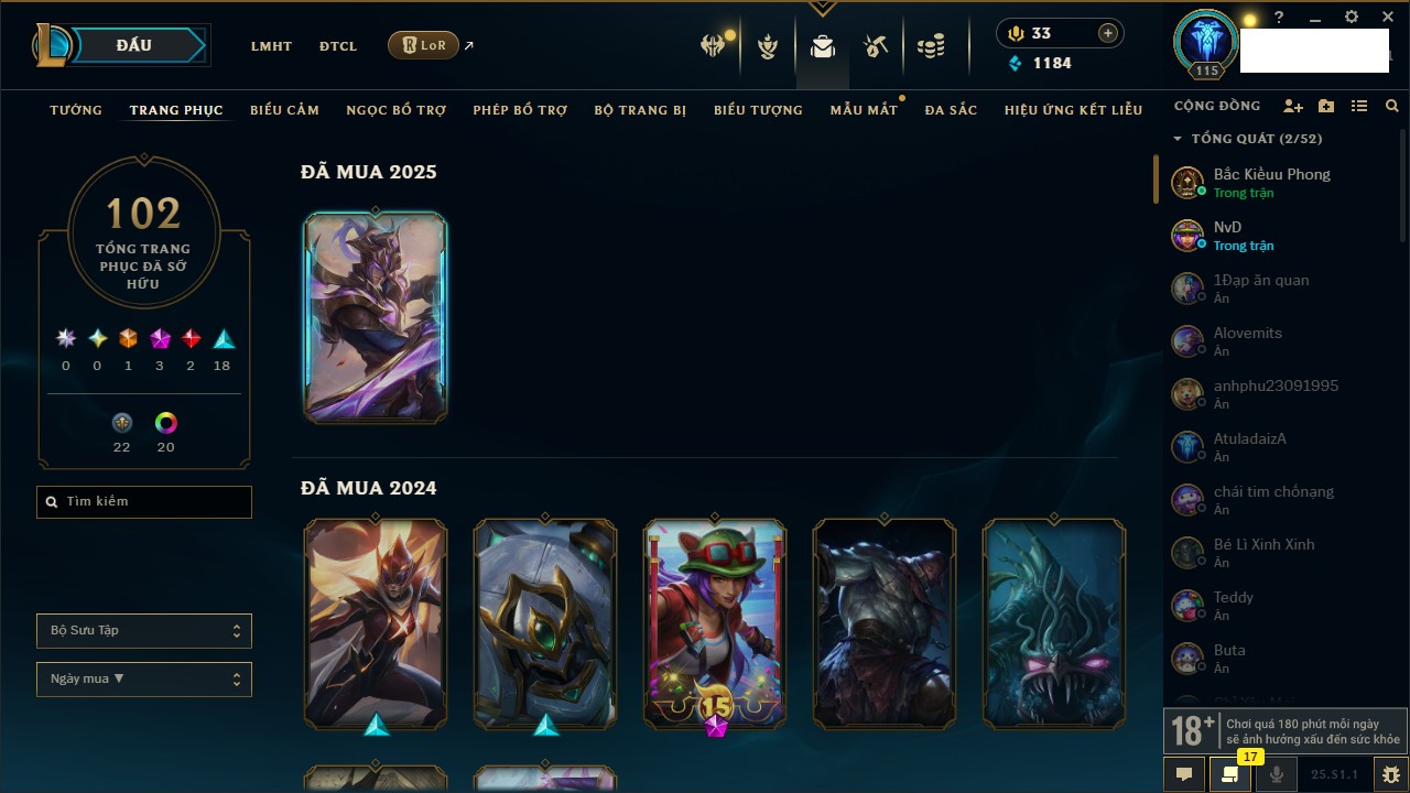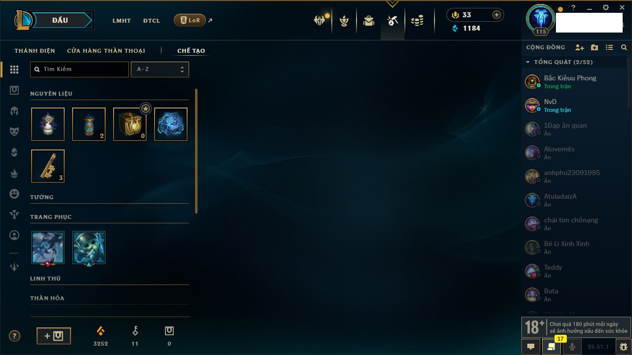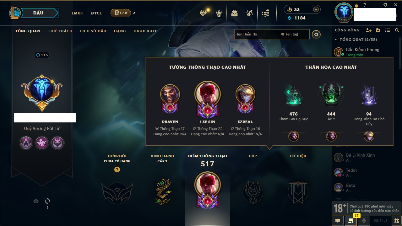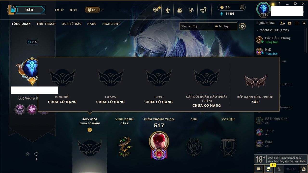 Rank Đơn: Đồng IIKhung: Chưa có khungTướng: 153 - Còn 32832 THXTrang Phục: 66Rank ĐTCL: Chưa RankLinh Thú: 7