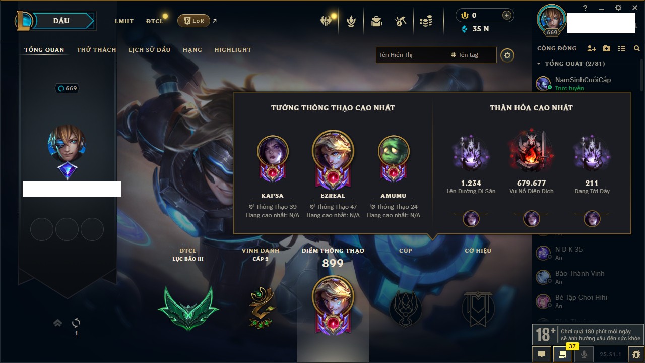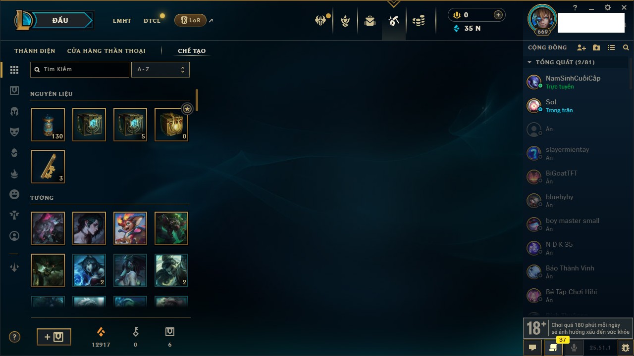 Rank Đơn: Chưa RankKhung: Chưa có khungTướng: 171 - Còn 164047 THXTrang Phục: 173Rank ĐTCL: Chưa RankLinh Thú: 77